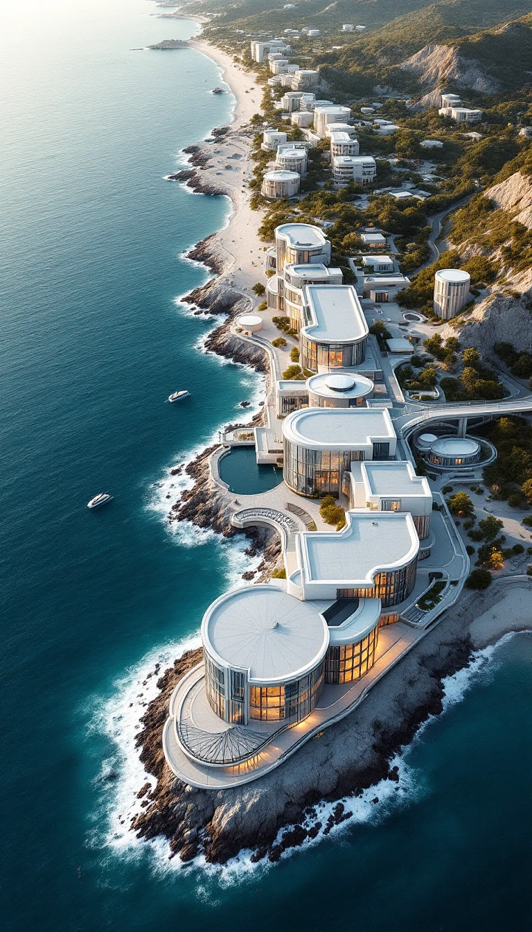 Ultra-realistic aerial cinematic view of Crimean coastline, focusing on modern luxury hotel complex. Minimalist architectural design with clean, geometric lines and flat white/gray roofs. Sleek contemporary buildings with glass facades, seamlessly integrated into coastal landscape. Pristine waterfront with architectural precision, minimal landscape intervention. Scandinavian and Japanese minimalist design influence. Sharp architectural lines, maximum transparency, neutral color palette - whites, grays, soft concrete tones. Modern infrastructure, subtle architectural bridges connecting buildings. Golden hour lighting with soft shadows, creating depth and sophistication. Hyper-detailed urban planning, 8K resolution, photorealistic architectural photography style. Emphasis on clean design, negative space, and architectural elegance. No traditional mountains, focus on smooth coastal terrain and cutting-edge architectural solutions.