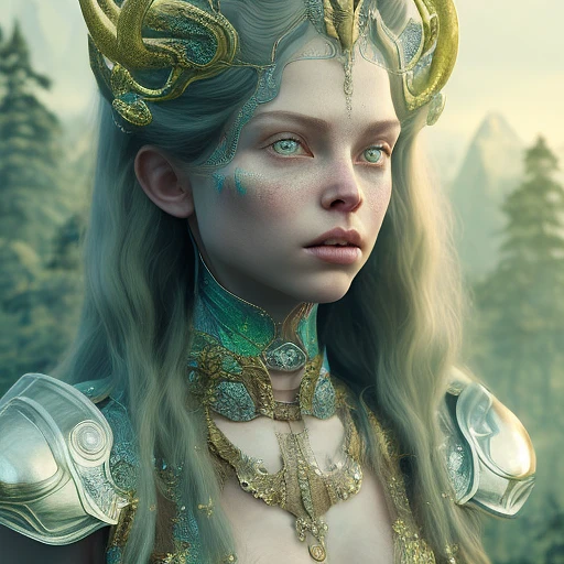 Morfydd Clark, big green eyes, lots of details, portrait, finely detailed armor, (wavy silver hair) , (highly detailed mountain forest scenery) , she wears a white and gold long loin cloth, cinematic lighting, intricate filigree metal design, 8k, unreal engine, octane render, realistic, redshift render