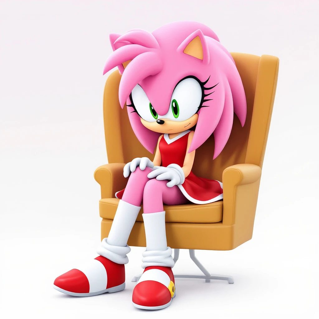 Amy Rose, from the Sonic games, is a pink female humanoid hedgehog, wearing white high socks and pink panties, wearing a red dress, sitting in a chair