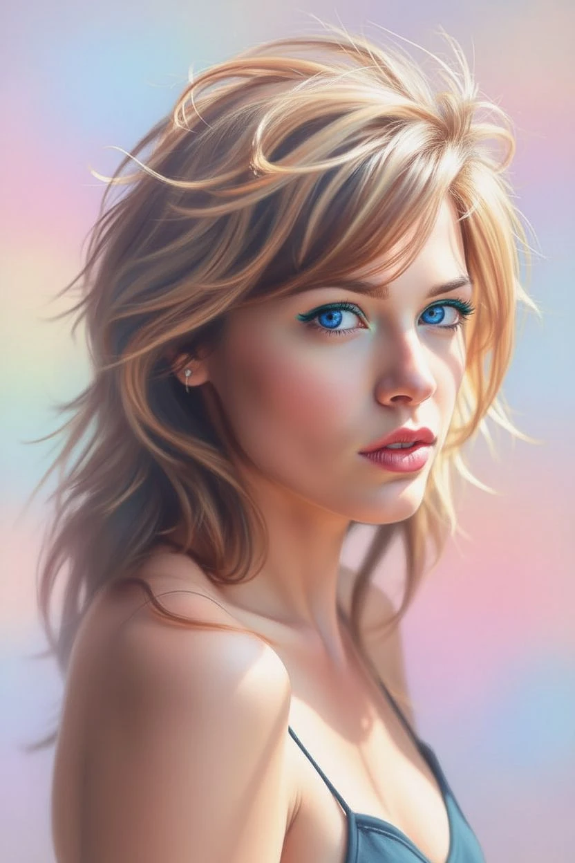 "Head and shoulders vertical fine art portrait, soft pastel colours, hazy atmosphere. Features an athletic supermodel, early 20s, warm light skin, tousled windswept bronde ombré bob, vivid sapphire blue eyes, turquoise eyeliner, parted red lips, cheeky smile, defined cheekbones, jawline. Centered composition, soft contrast, high saturation. "