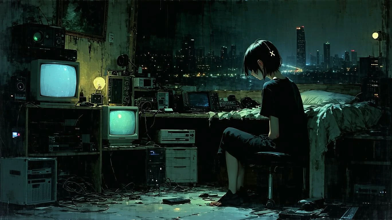 Jeremy Mann, 1 girl , solo, sitting, john berkey, messy room, (iwl:1.3) , looking afar, short hair, bangs, brown hair, hair ornament, brown eyes, closed mouth, hairclip, expressionless, looking at viewer, dead eyes, depressed, black t-shirt, (x hair ornament:1.2) , (asymmetrical hair, single sidelock:1.3) , indoors, (messy room, night, dark:1.3) , ( sketch, outline:1.1) , ( cyber, lot of cable, retro computer, IT gadget, PC parts:1.2) , <lora:Lain:1> , cityscape, sckyscrsaper, <lora:cibo:0.6> , Maurits Escher, perspective, stairway, bridges