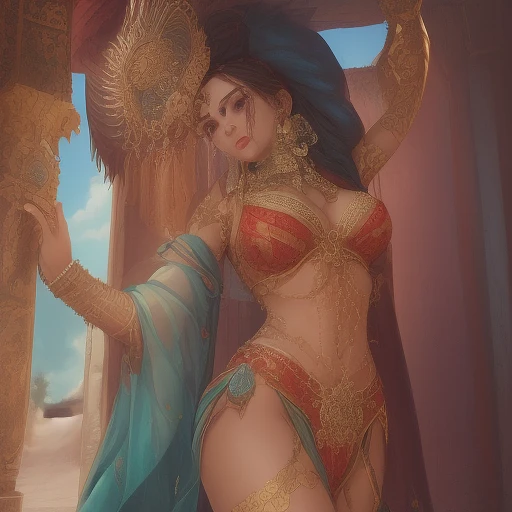 *The Image* *Description* A breathtakingly detailed, hyper-realistic depiction of a gorgeous woman in a stunning red belly dancing outfit, adorned with intricate gold jewelry and a majestic forehead piece, and accentuate her beauty, her stomach is taut and chiseled, standing seductively in a serene desert temple with ornate pillars. *Character Details* - Exquisite, photorealistic face with precise cosmetic features -Stunning, detailed eyes sparkling with vitality - Full, luscious lips - Flawless, radiant skin - lithe, taut chiseled stomach, DD breasts, accentuated by the fitted top and bottom. - waist length luscious, dark hair cascades beautifully around her. - wears a matching red skirt and bra, exuding an air of exotic elegance, both are adorned with gold accents, golden embroidery and green gemstones. - The skirt is split at the front, revealing her leg, is adorned with gold accents, gold embroidery, and green gemstones. *Attire and Accessories* - Gold jewelry, gold chains, wrist cuffs, upper arm coifs, belly button adornment, thigh bands, ankle cuffs, headpiece and a gold band encircling the neck add a touch of luxury, elegance, beauty and mystery. - Intricate embroidery and patterns decorate the outfit along with green gemstones *Environment* - Soft, golden lighting creates an enchanting ambiance. - Fantasy desert temple background with ornate pillars, ethereal, swirling clouds - Dramatic, cinematic lighting with soft, golden hues - Wide-angle perspective, emphasizing grandeur *Overall Mood* - The woman's pose and attire evoke a sense of mystery and allure. - Her confident stance suggests she is about to perform a mesmerizing dance. *Rendering Details* - 8K resolution with sharp focus - Hyper-realistic rendering with extreme details - Photorealistic textures and shading - Cinematic, high-contrast lighting
