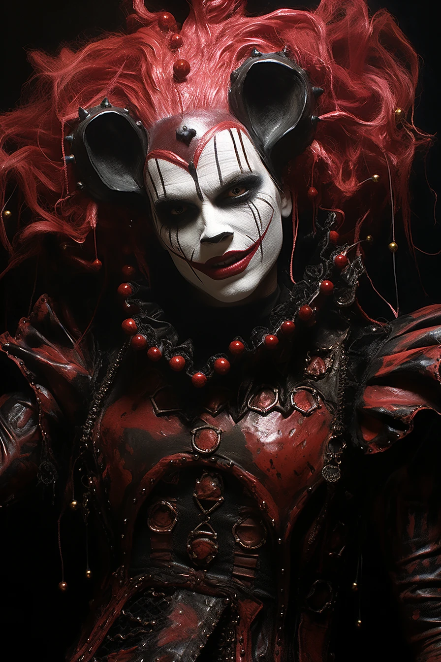 Painting offemale punk clown costume by robin, full body, in the style of dark and dramatic chiaroscuro portraits, gothic dark and ornate, dark crimson and light crimson, expressionist emotion, epic fantasy scenes, blink-and-you-miss-it detail --ar 83:125