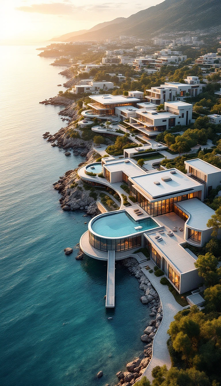 Ultra-realistic aerial cinematic view of Crimean coastline, focusing on modern luxury hotel complex. Minimalist architectural design with clean, geometric lines and flat white/gray roofs. Sleek contemporary buildings with glass facades, seamlessly integrated into coastal landscape. Pristine waterfront with architectural precision, minimal landscape intervention. Scandinavian and Japanese minimalist design influence. Sharp architectural lines, maximum transparency, neutral color palette - whites, grays, soft concrete tones. Modern infrastructure, subtle architectural bridges connecting buildings. Golden hour lighting with soft shadows, creating depth and sophistication. Hyper-detailed urban planning, 8K resolution, photorealistic architectural photography style. Emphasis on clean design, negative space, and architectural elegance. No traditional mountains, focus on smooth coastal terrain and cutting-edge architectural solutions.