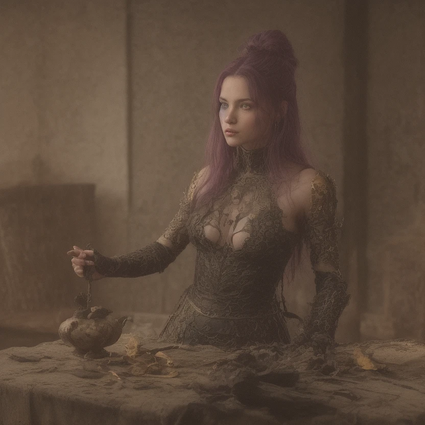 A maiden sorcerer at a table of a medieval inn as the backdrop. Extra long purple tresses, a taut body with chiseled abdomen, radiant dark green eyes, large bosom seemingly threatening to bust free, adorned in a black ensemble with intricate bright gold accents. The armor looks supple and flexible, suggesting a high degree of craftsmanship. The halter top and bare waist, accentuating the woman's curves. The bright gold accents are etched into the leather in an ornate, swirling pattern, adding a touch of elegance to the overall design. The arm bands are segmented, allowing for flexibility and movement. They are adorned with smaller, matching silver accents that echo the design on the corset. The leather skirt falls just bellow the mid thigh and appears to be pleated or tiered, allowing for ease of movement. The edges of the skirt are trimmed with a thin, silver strip that catches the light. Overall, the armor seems to be designed for both functionality and aesthetics. It hugs the woman's curves, accentuating her strength and agility while also conveying a sense of beauty and craftsmanship.