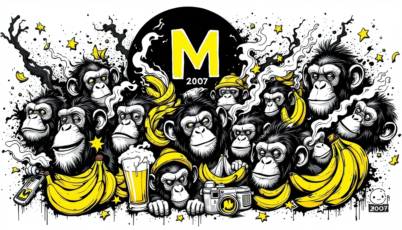 An intricate and mainly black, white, yellow, green, (two contrasting, extra colors for details) , graffiti-style poster featuring various elements, such as chimp cartoon characters, symbols of urban culture, smoke and dynamic expressions, focusing on minimalistic chimp faces, the letter 'M' inside a large circle, bananas, beer, is part of the image. the word and '2007' is hidden --ar 63:128 --stylize 750