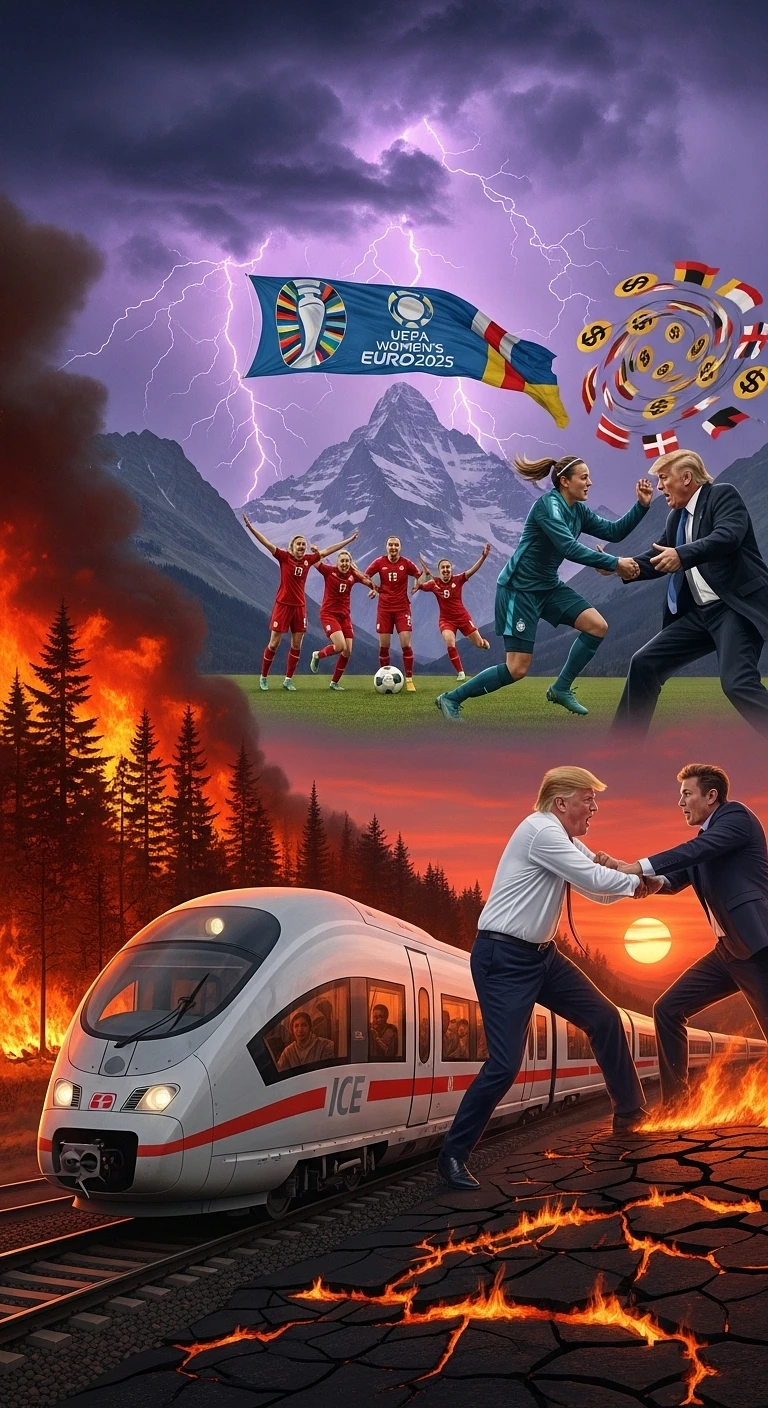 (In the moody twilight of a tempestuous summer evening, a sleek ICE train bursts through the frame, its polished metal glinting under the last rays of a blood-red sun, each carriage window casting distorted silhouettes of passengers caught between fear and resolve. To the left, a ravenous wildfire devours parched German pines, the air shimmering with heat mirages as cracked asphalt peels back like burnt paper beneath the inferno. On the right, two colossal, stylized figures—Trump and Musk—are locked in a gravity-defying tug-of-war, their hands clutching swirling icons of dollar signs, rockets, and partisan flags that whirl around them like a political cyclone. Behind this spectacle, the vibrant banner of UEFA Women’s Euro 2025 ripples above jubilant female players leaping against the serene Swiss Alps, a beacon of unity amid chaos. Above it all, roiling storm clouds crack with violet lightning, their electric tendrils illuminating the scene in staccato flashes, a final symbol of mounting climate and ideological turmoil.)