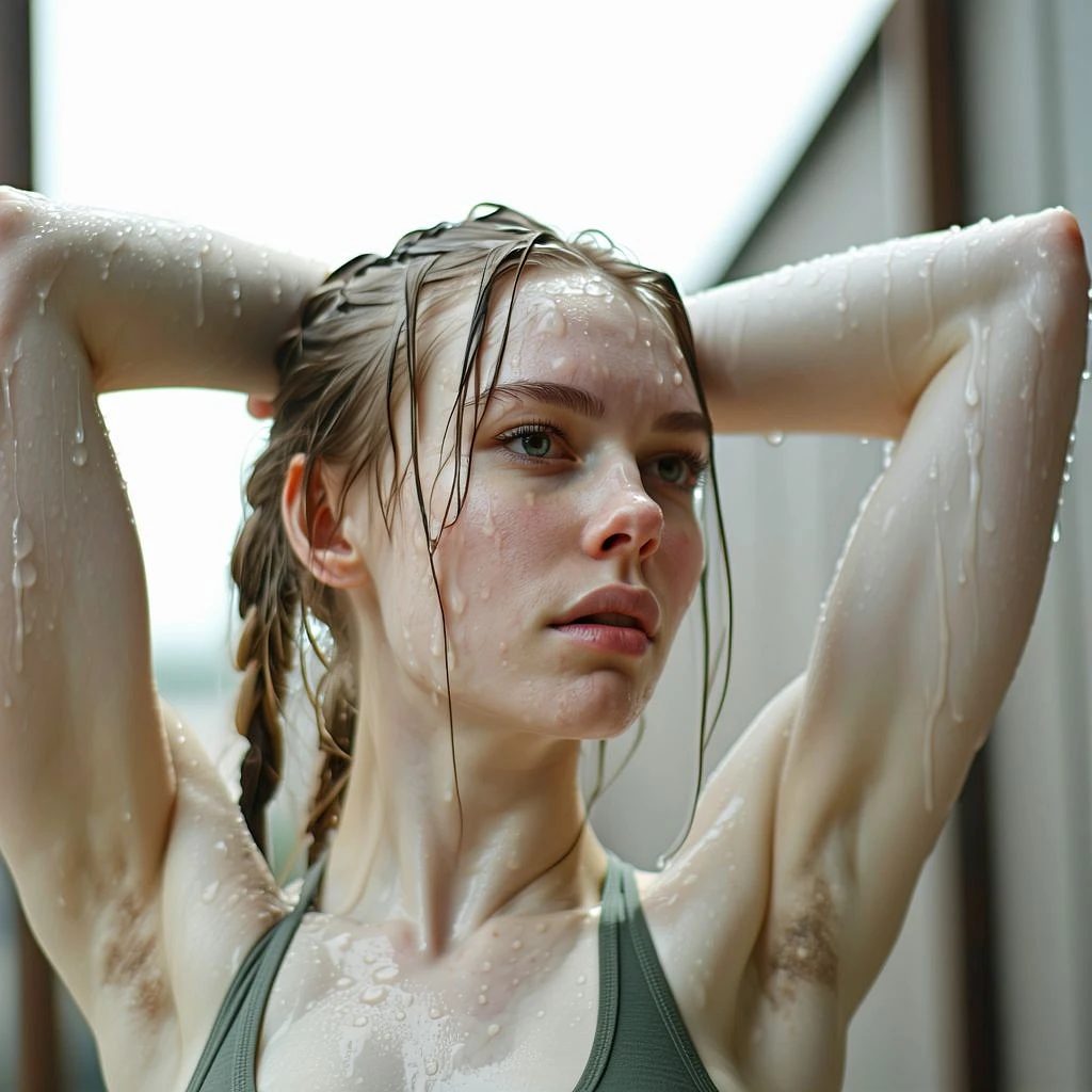 Photo of a ultra realistic white female, arms up over head, head on shot, in tank top, close up 8k, hyper realistic, focused, extreme details, intricate, sweat