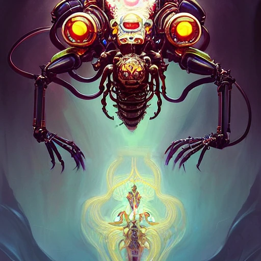 portrait biomechanical spider king, cyberpunk, bionics, augments, lights, cables, elegant gleaming intricate baroque jewellery, colorful, vivid, imposing, epic, digital painting, artstation, concept art, by peter mohrbacher and wlop and rhads,