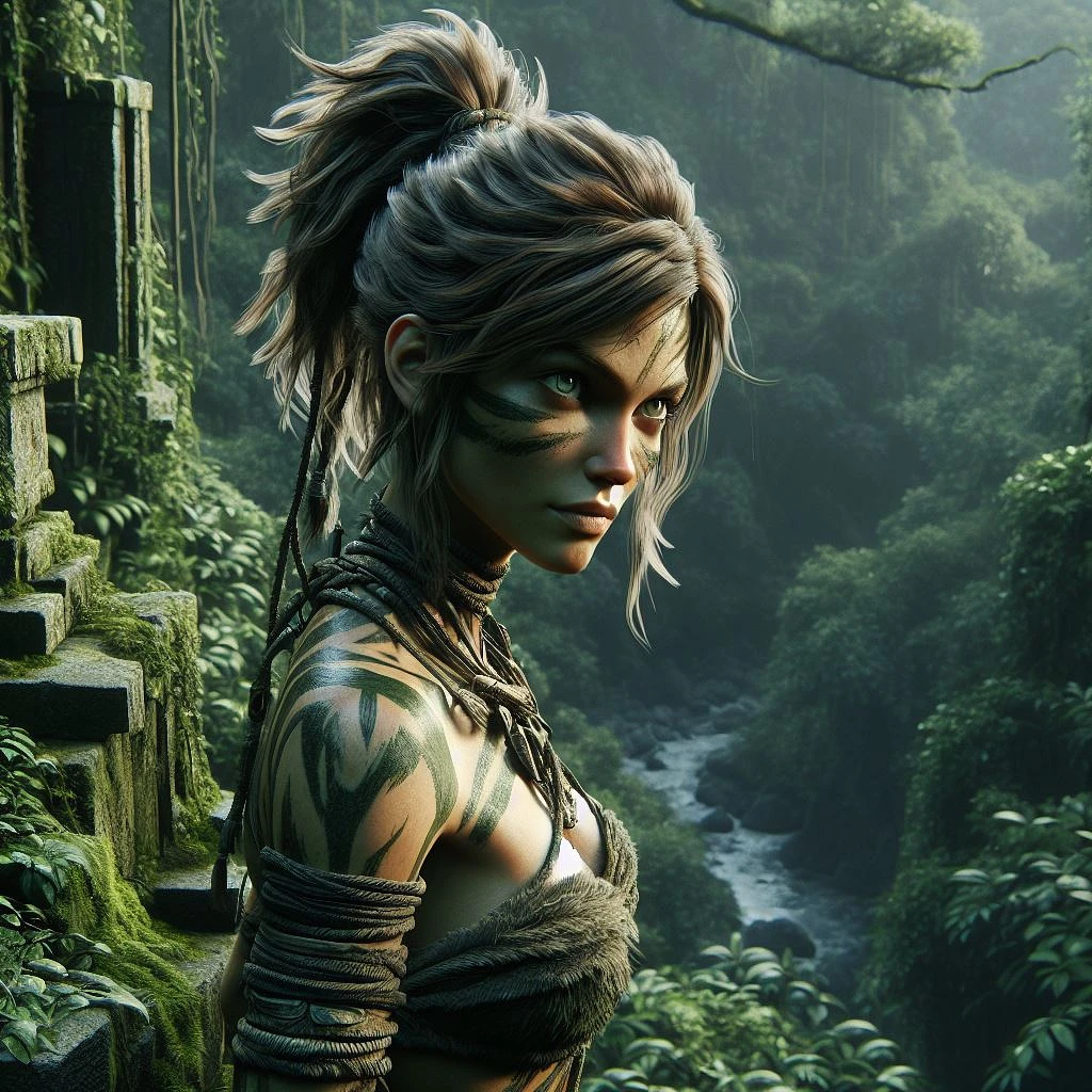 In a lush, overgrown jungle, Eira, a fierce, agile warrior-queen, stands atop an ancient stone temple, her eyes scanning the horizon for threats. The artistic 3D portrait, utilizing advanced lighting and texture mapping techniques, captures every photorealistic detail, showcasing Eira's powerful, athletic form and intricate, tribal adornments in a visually stunning, faithful representation that embodies her strength, courage, and unwavering leadership.