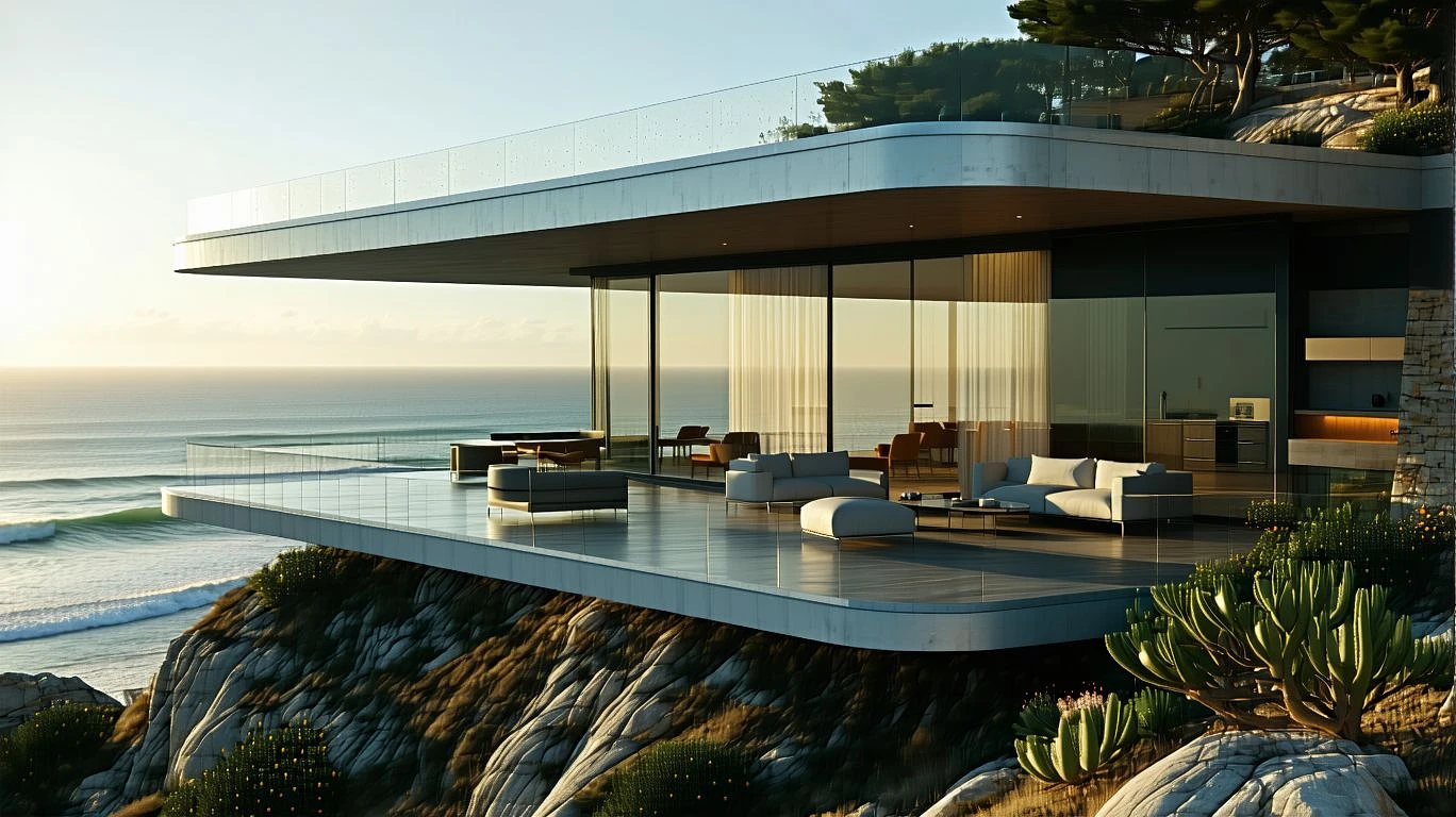 Hyper realistic eye level exterior photo of a mid century modern style house overlooking the ocean, daylight, indirect lighting, AD magazine, Frank Lloyd, Eames, Mies van der Rohe