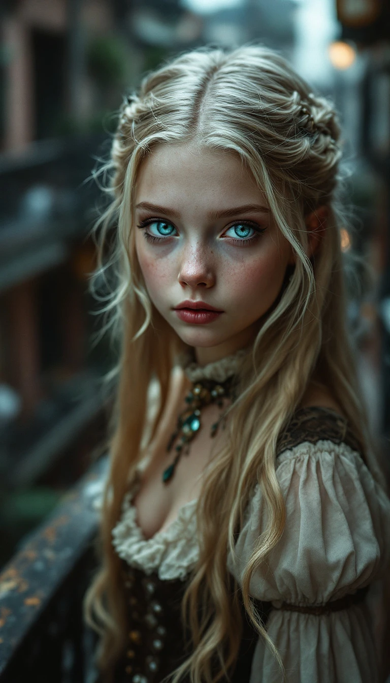 a professional photo of a eleven year old vampire girl, (futuristic) , (masterpiece) , (realistic) , (perfect anatomy) with long blonde hair large beautiful brilliant Forest Tea red-green-blue-pink-silver-brown-golden eyes, , standing on a belcony, in 1860's New Orleans, dressed in the fashion The Vampire Diaries (8k) , (high res) , ultra-detailed, photo-realistic, front view, highly detailed, volumetric, dramatic light Perfect graphics, ultra-detailed, photo-realistic, full image view, full body view, front view er