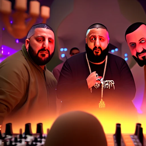 DJ Khaled surrounded by evil goblins, 8k, ultra realistic, nanites, 3D, volumetric lighting
