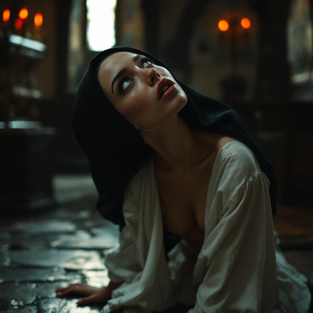 <lora:Expressive_H:1> Expressiveh, <lora:warm light style:1> warm light style, close up, score_9, score_8_up, score_7_up, bending over a bench in a dark room of a church and pulling her robe aside showing her ass, small ass, skinny ass, skinny body, tiny ass, an intimate close-up of a young nun in her 20s, head tilted slightly to the back and looking upwards, exuding an unexpected allure with big lips, her facial expression is lustful and naughty, she offers herself submissively and reveals her naughty intentions, the composition framed slightly from the side, the stone floor of a old church in the background, highly detailed background, ethereal light illuminating the scene, creating a juxtaposition of innocence and lasciviousness; the setting featuring richly textured fabric and subtle religious symbols
