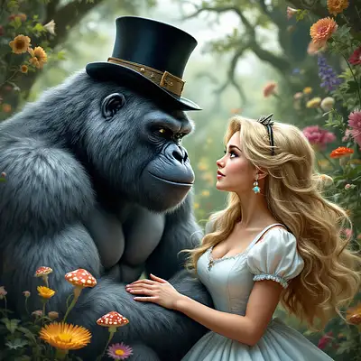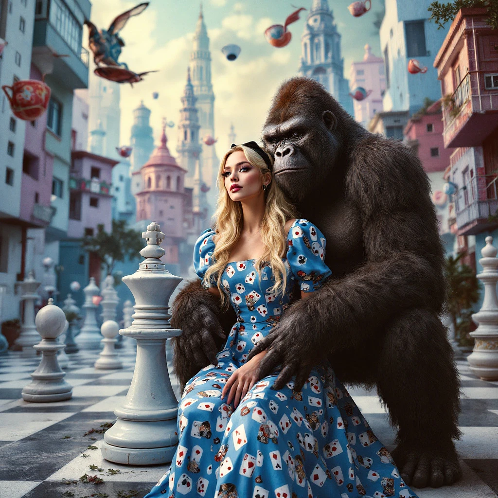 A stunning, avant-garde interpretation of Alice in Wonderland, featuring a modern woman as Alice, sitting confidently on a fantastical chess piece. The Alice character dons a fashionable Blue dress intricately patterned with playing cards, her blonde hair cascading down her back. A black head band in her hair. A big gorilla protecting alice, the gorilla has humanlike muscles and stance with a focus look on his face The surreal backdrop reveals a dreamscape cityscape, composed of distorted, abstract buildings and floating tea cups. The atmosphere merges classic Wonderland elements with contemporary urban chaos, creating a vibrant, dark fantasy realm. The imagery is captured in a cinematic, illustrative, and painterly style that encapsulates the conceptual art vision. , cinematic, conceptual art, painting, vibrant, photo, dark fantasy, illustration