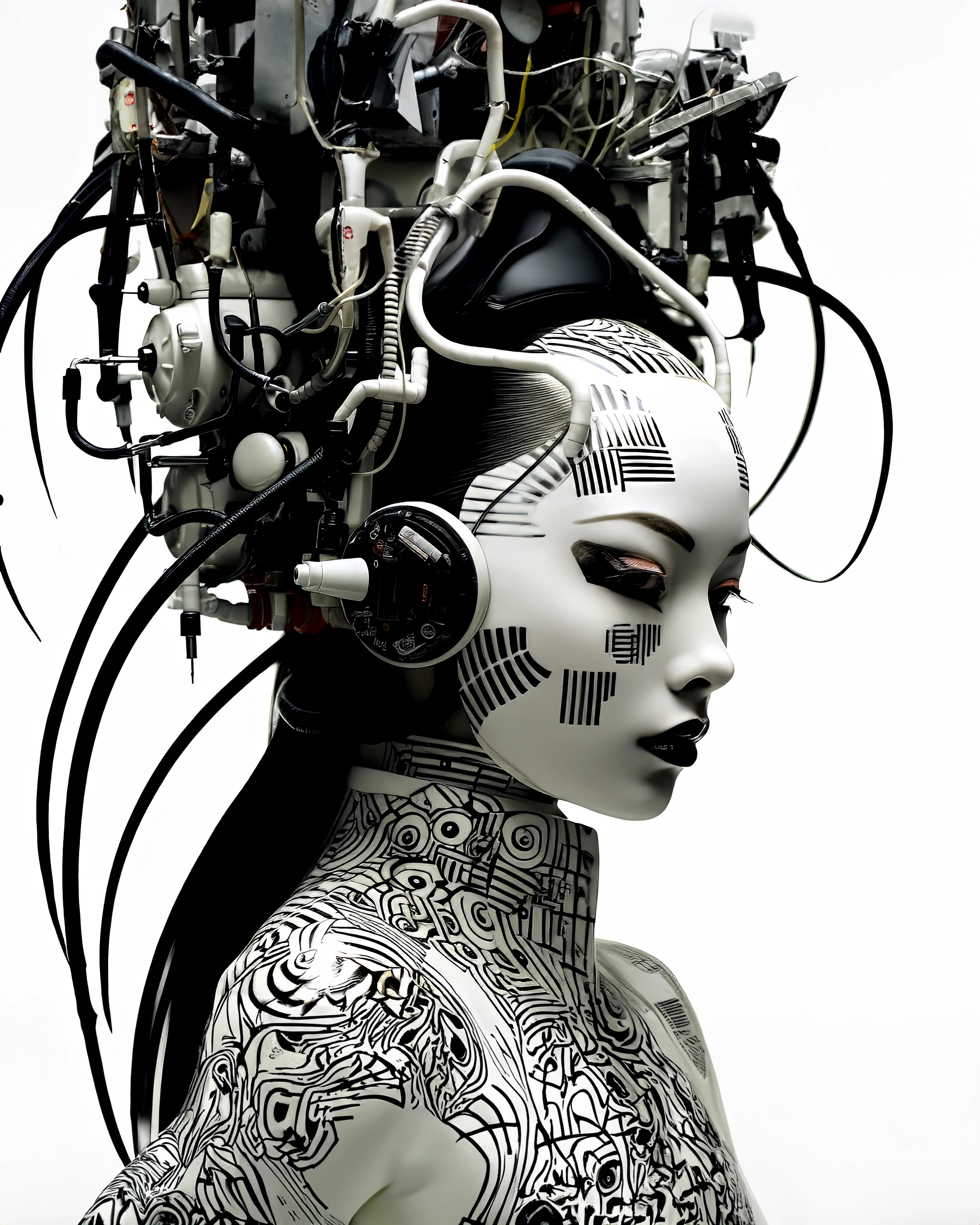 a woman wearing a white and black costume with black wires in the face, in the style of mechanized abstraction, multidimensional shading, sculptural use of paint, geisha portraits, made of insects, futuristic chromatic waves, constructivist roots --ar 306:229 --s 750 --style raw