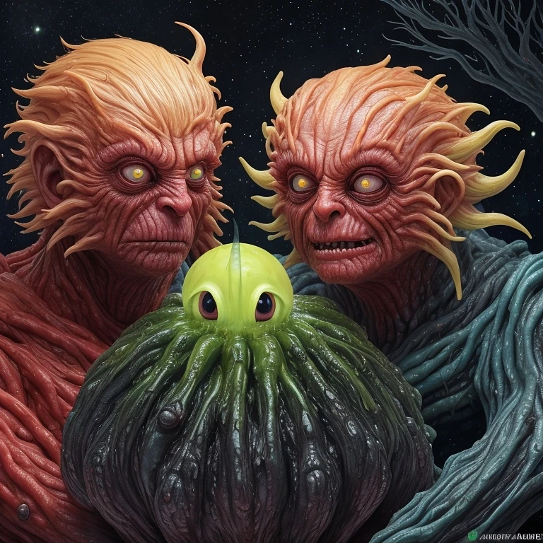 donald trump and joe biden as a horror creatures from Space. terraforming. Alien Flora, large gazing eyes, close-up, hyper detailed, rich colours, red green, rich dark shadows, yellow, bioluminescent, colourfull, glow, fluid slime glowingslobber, oozing, dripping, moist, fleshy, trending on artstation, sharp focus, studio photo, intricate details, highly detailed, glossy, slimy, mucous, by greg rutkowski detailed face, detailed skin, full body, g string, rear shot, dripping in sweat, large chest, raining blood