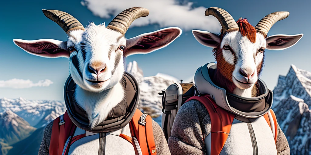 portrait of a two gorgeous goat-womans hybrid dressed as hikers, centered, standing on the top of the world, mountains in background, with fur-skin, attractive, flirting, photography, detailed skin, realistic, photo-realistic, 8k, highly detailed, full length frame, High detail RAW color art, diffused soft lighting, shallow depth of field, sharp focus, hyperrealism, cinematic lighting