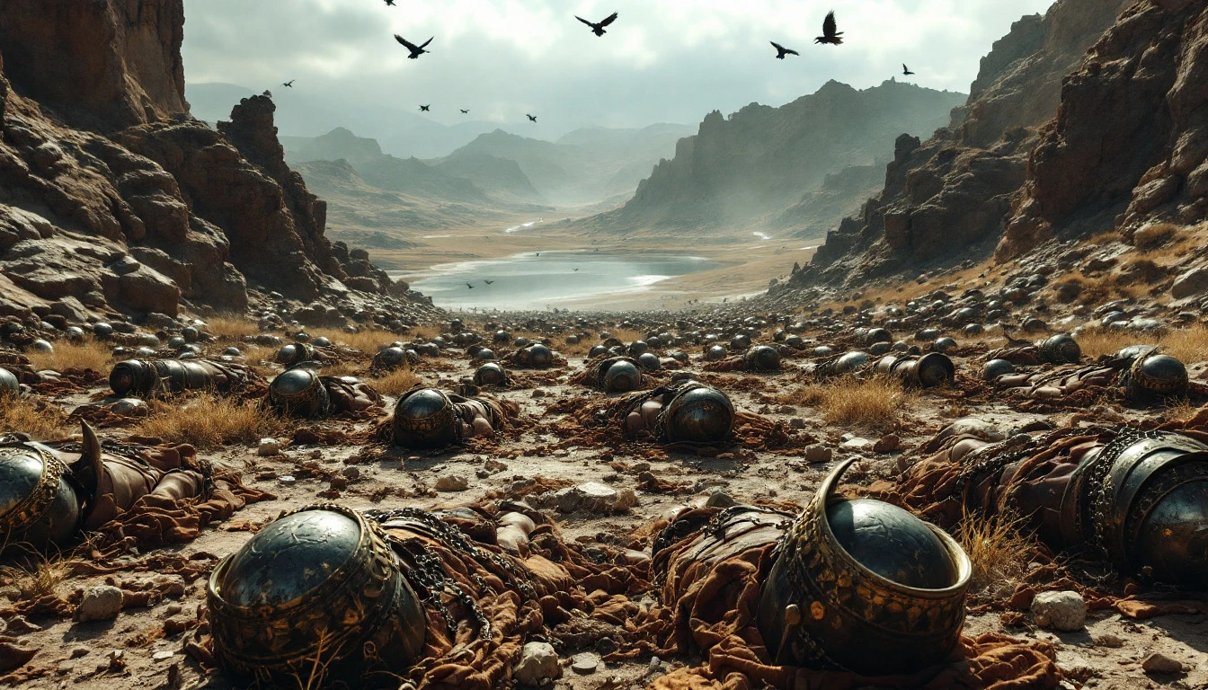 Ultra-realistic . Wide shot of the now silent pass, only the sound of the wind and the crows can be heard. [Fallen warriors in Achaemenid Persian helmets and helmets with chain veils lie scattered across the scene.]