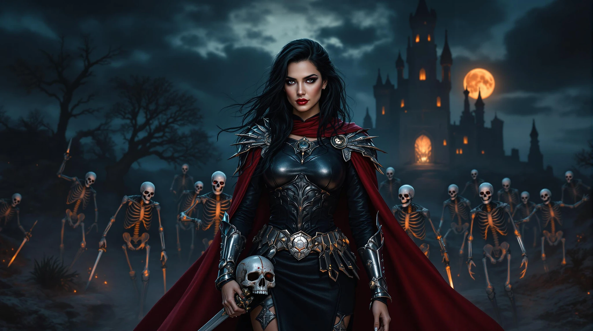A woman's hair is long, dark black, and falls down her back in loose waves. A few loose strands frame her face, adding to her fierce and determined expression. Her hair is thick and luscious, with a subtle shine that catches the light. She wears a black dress with a high neckline and long sleeves, made of a thick, heavy material that appears to be leather or a similar texture. The dress is fitted closely to her body, accentuating her curves and athletic build. Over the dress, she wears a red cape that flows behind her, adding a pop of color to the otherwise dark scene. The cape is made of a lightweight material and is clasped at the shoulder with a silver brooch. She has silver armor pieces, including a chest plate, shoulder guards, and a belt, which add to her warrior-like appearance. The armor is intricately designed, with patterns and shapes that reflect the light. The chest plate is shaped like a dragon's head, with the mouth open and the tongue extended. The shoulder guards are shaped like wings, with feathers etched into the metal. She wears no visible jewelry, other than the silver armor pieces and the brooch that clasps her cape. Her ears are pierced, but she wears no earrings. Her makeup is minimal, with a focus on natural, earthy tones that complement her pale skin. Her lips are painted a deep red, which adds to her dramatic and intense appearance. She stands with her feet shoulder-width apart, her weight evenly distributed between both legs. Her right hand holds a sword, which is positioned at her side. Her left hand holds a skull, which is positioned in front of her. Her head is held high, with her eyes fixed intently on some point in the distance. The skeletons are positioned in the background, surrounding the woman in a semi-circle. They are dressed in tattered and worn clothing, with visible bones and a ghostly appearance. Some of the skeletons are holding weapons, such as swords and shields, which adds to the sense of danger and foreboding. The skeletons are positioned in various poses, some standing, some kneeling, and some lying on the ground. They appear to be moving towards the woman, which adds to the sense of tension and conflict. The skeletons' faces are blank and expressionless, with empty eye sockets and a skeletal grin. They appear to be mindless and driven solely by a desire to attack the woman. The sky is dark and cloudy, with a full moon visible in the distance. The moon is a deep orange color, which adds to the sense of foreboding and danger. The ground is rocky and barren, with a few scattered trees and bushes. The trees are twisted and gnarled, with branches that appear to be reaching out like skeletal fingers. In the distance, a castle is visible, with tall towers and battlements. The castle appears to be in a state of disrepair, with crumbling walls and a broken gate. Flames are visible in the windows, which adds to the sense of danger and conflict. The lighting in the image is dark and moody, with a focus on dramatic shadows and highlights. The woman is illuminated by a soft, golden light, which adds to her heroic and warrior-like appearance. The skeletons are illuminated by a cold, blue light, which adds to their ghostly and otherworldly appearance. The lighting in the image is predominantly cool, with a focus on blues and purples. This adds to the sense of darkness and foreboding. The lighting is dramatic, with deep shadows and highlights. This adds to the sense of tension and conflict. The lighting appears to be coming from a single source, which is positioned above and to the left of the woman. This adds to the sense of drama and tension. The image is rendered in a wide-angle perspective, capturing the full scope of the scene and creating a sense of depth and scale. The style is reminiscent of fantasy art, with a focus on dramatic lighting, bold colors, and dynamic composition. The camera is positioned at a slight elevation, looking down on the scene and emphasizing the woman's heroic and warrior-like appearance. The camera used to capture this image is likely a digital SLR or mirrorless camera with a wide-angle lens, capturing the full dynamic range of the scene.