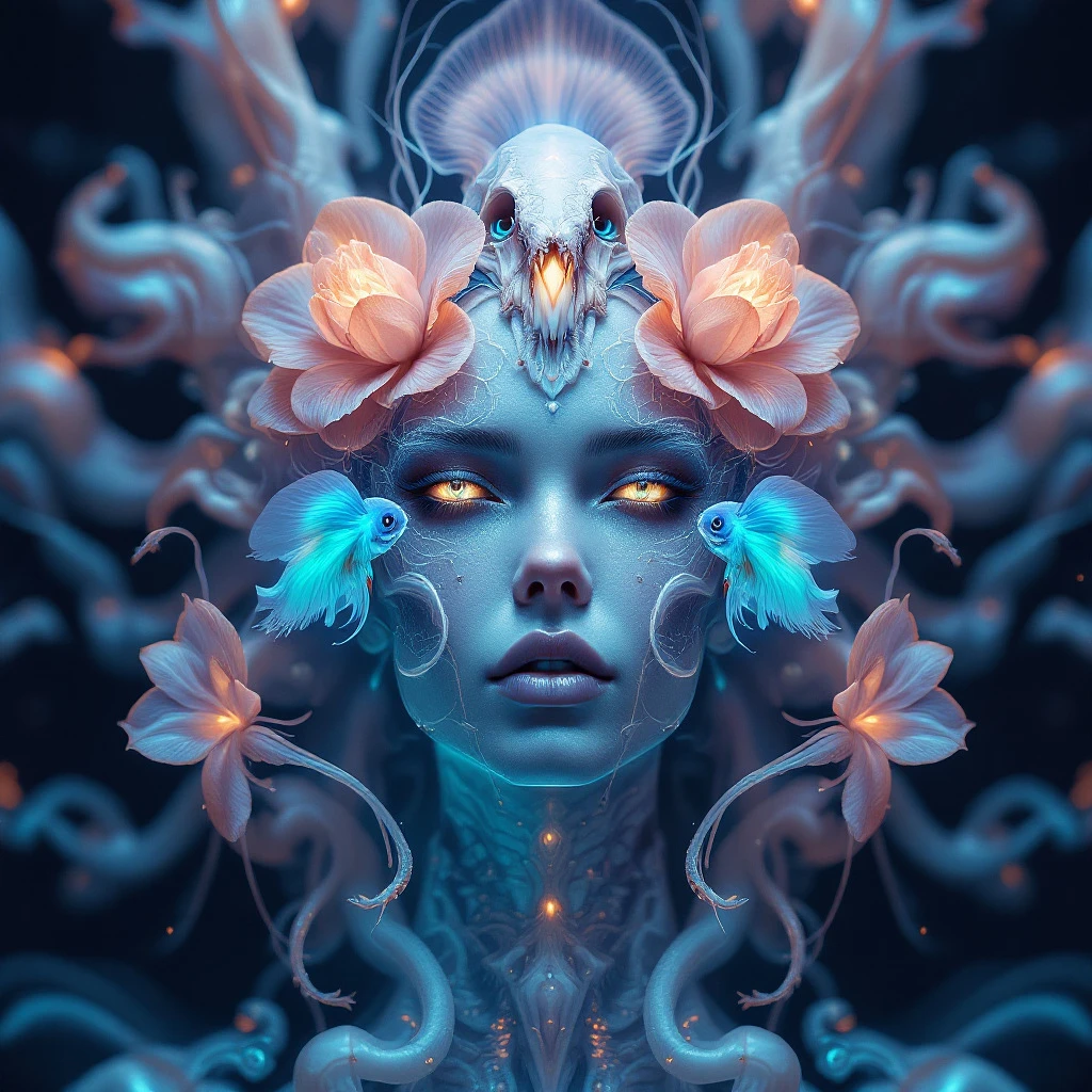 Goddess close-up portrait ribcagel. jellyfish phoenix head, nautilus, orchid, skull, betta fish, bioluminiscent creatures, intricate artwork . octane render, trending on artstation, t symmetrical artwork. cinematic, hyper realism, high detail, octane render, 8k