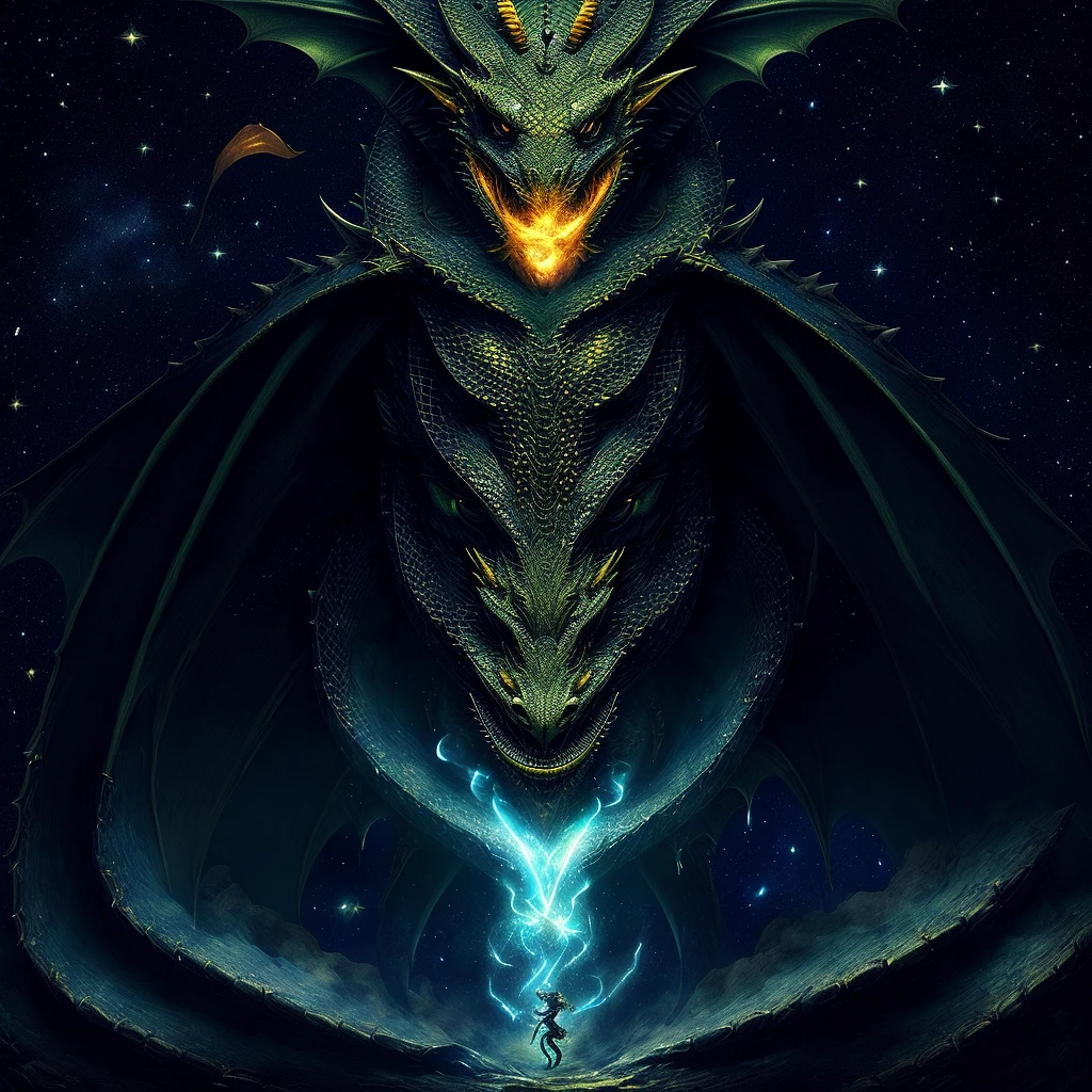 a (dragon:1.2) (battlemage) holding a greatsword and magic in hand, night, stars in the sky, smoke particles, ash, depth of field, hyperrealistic, masterpiece, by van gogh and michaelangelo <lora:epi_noiseoffset2:1.0>