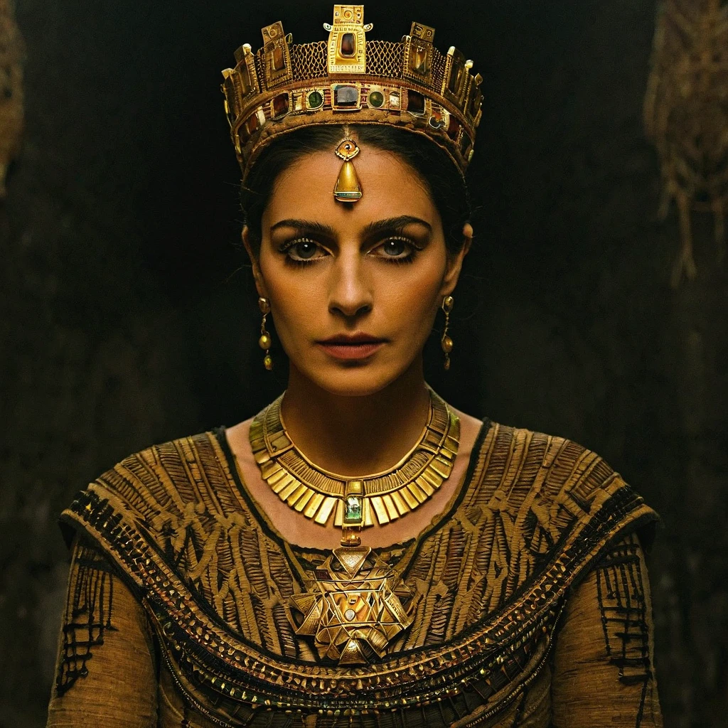 The image features a dead old queen in full attributes, depicted as a mummy. She is wearing a crown and a necklace, with a gold crown on her head and a gold necklace around her neck. The mummy's face is skeletal, and she appears to be wearing a gold and black dress. The scene is set in a dark environment, with a black background and a few lights illuminating the mummy. The overall atmosphere of the image is eerie and mysterious, as it captures the essence of a long-deceased queen preserved in her tomb. (controlnet_mode:canny juggernautXL_v5, sdxl-1.0.0.9. safetensors, SeargeSDXL4.2-Llama2 prompt) , in style of a well-known photographer. Highly detailed. 12K.
