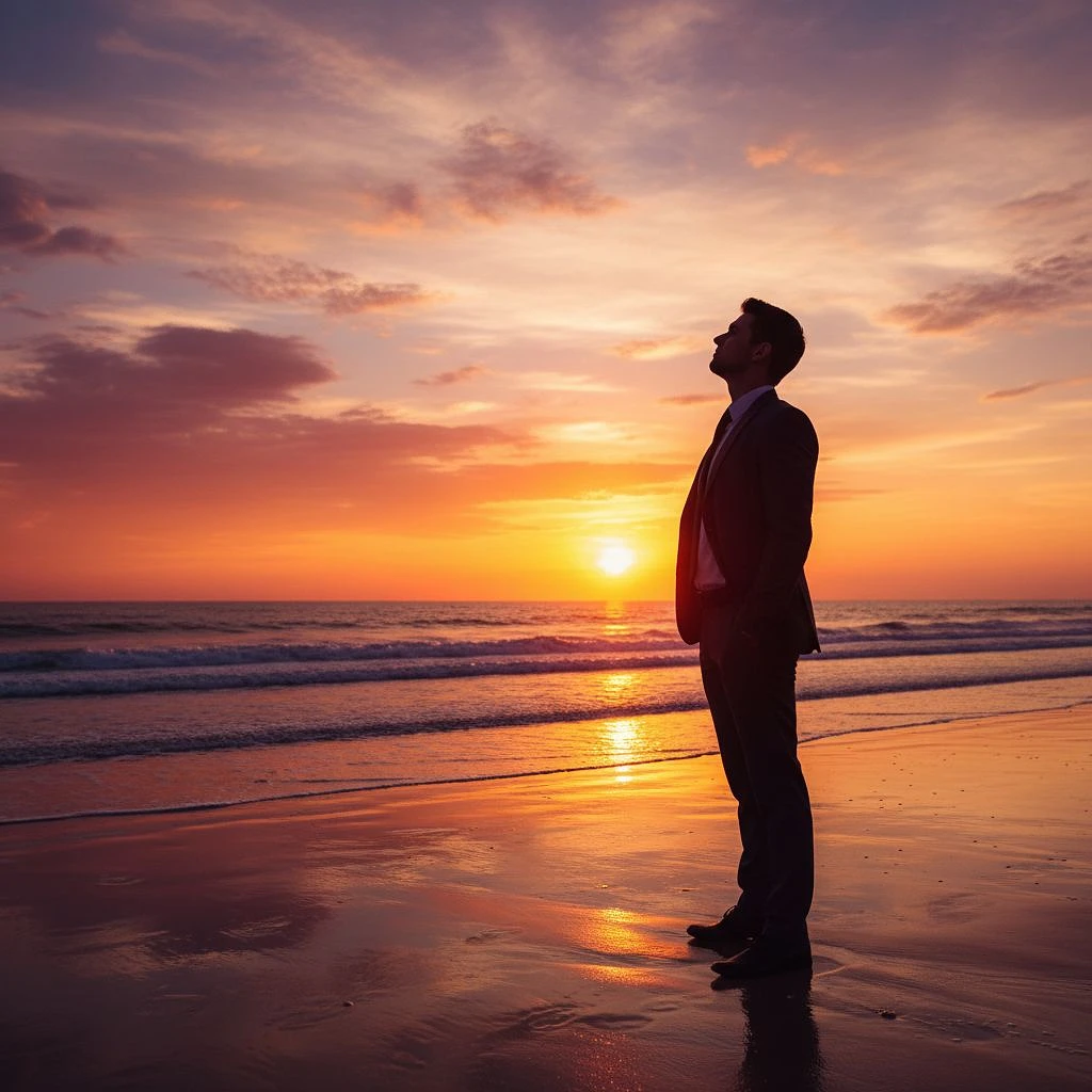 Estilo tipo inspirador. Paisaje: playa al atardecer. Un hombre lleva un traje de vestir con su mirada al horizonte, vista a la distancia con su cuerpo en perfil, podemos ver el perfil de su rostro a la camara, distant view, mira hacia el cielo, el sol ilumina sus rostros. Es importante que aparezca solo la silueta, distant view. No se le ve la cara.