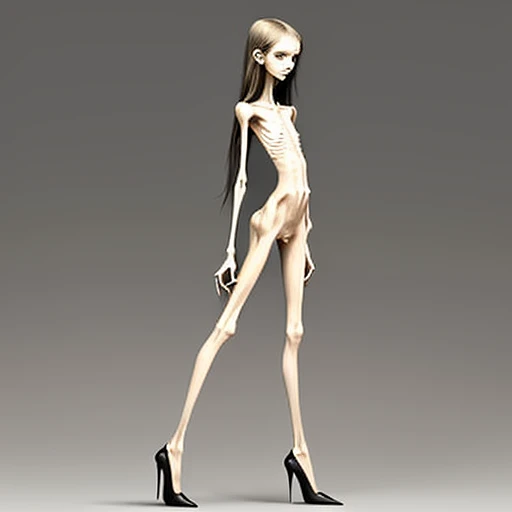 a needle-thin anorexic girl with skinny long legs and long skinny calves in high heels with long hooked claws, naked