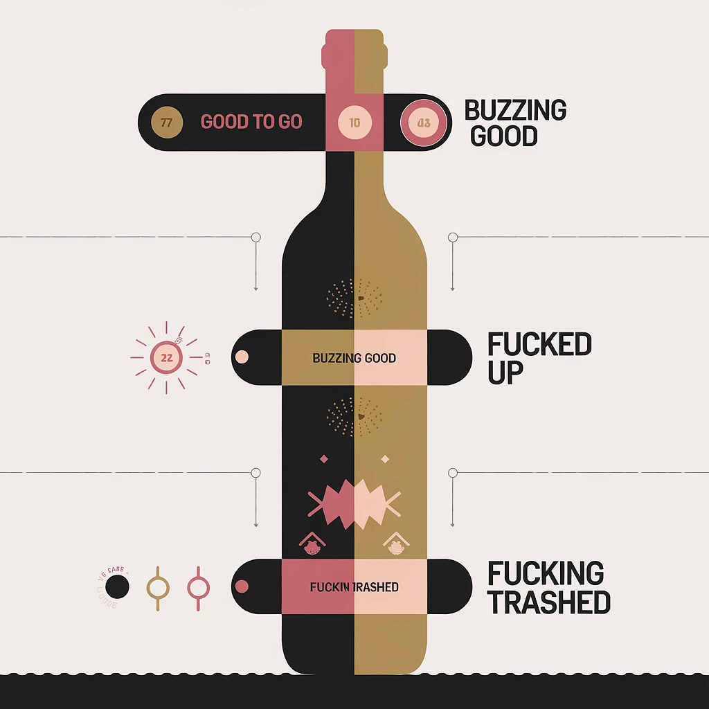 Create an infographic showing the stages of drunkenness using a wine bottle as the main element. The wine bottle should be vertical and aligned in the center of the image. It should be divided into four sections vertically: 1. The top quarter of the bottle should have a label saying "Good To Go". 2. The halfway mark should have a label saying "Buzzing Good". 3. The three-quarters mark should have a label saying "Fucked Up". 4. The bottom of the bottle should have a label saying "Fucking Trashed". Each section should be distinct and clearly labeled, with colors and graphics that represent each stage of drunkenness. The background should be clean and simple to emphasize the wine bottle and the labels. The overall style should be modern and minimalistic.