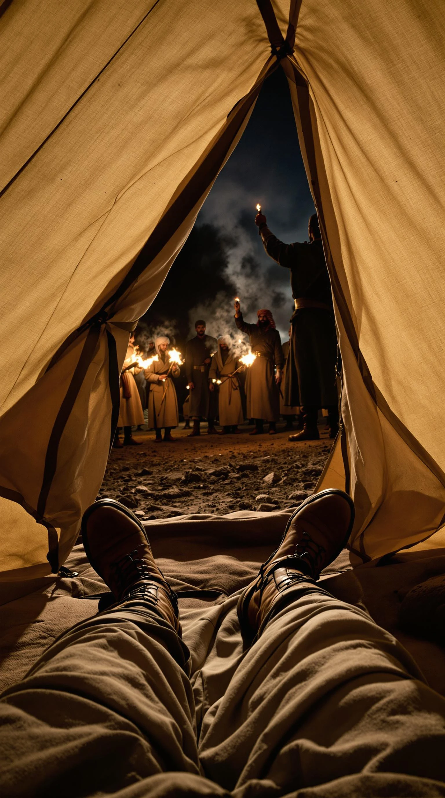 POV first-person perspective shot captures the lower half of my body as I lie inside a traditional canvas tent. I am dressed in the historical attire of Arab soldiers—a long, loose-fitting tunic made of lightweight fabric, designed for comfort and movement in harsh climates. A belt cinches the garment at my waist, keeping it secure. On my feet, I wear historical military footwear—sturdy leather boots with thick soles, reinforced for endurance on long marches and rugged terrain. The worn leather creaks slightly as I shift my position. The entrance of the tent is directly in front of my feet, partially open, revealing the dark night beyond. Flickering light dances across the ground as a group of soldiers, dressed in the same historical garments, stand outside, engaged in their own tasks. They hold torches, their flames casting long, wavering shadows across the landscape. Their focus is elsewhere, occupied with their duties, unaware of my gaze. The night is quiet, save for the occasional crackle of fire and the distant murmur of voices.