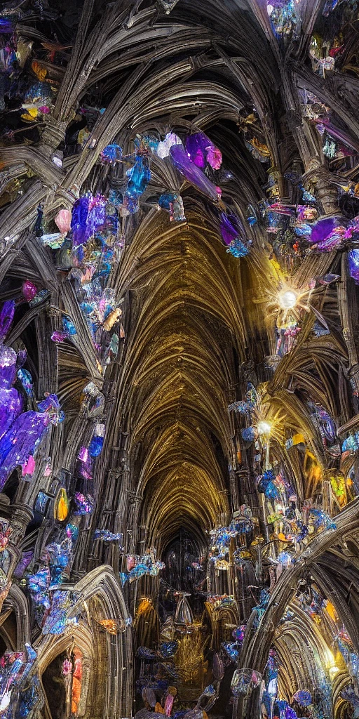 ultra realistic illustration and highly detailed digital render of panorama view in a dark underground cavern, vaulted, cathedral interior, rich in huge colorful crystal deposits, colorful crystals, highly detailed, vibrant and vivid, smooth, crystals, gems, geode, darkness, minereal deposits, cinematic, high contrast, hdr, 4 k, unreal engine, magical, hyperrealistic, bokeh, dof