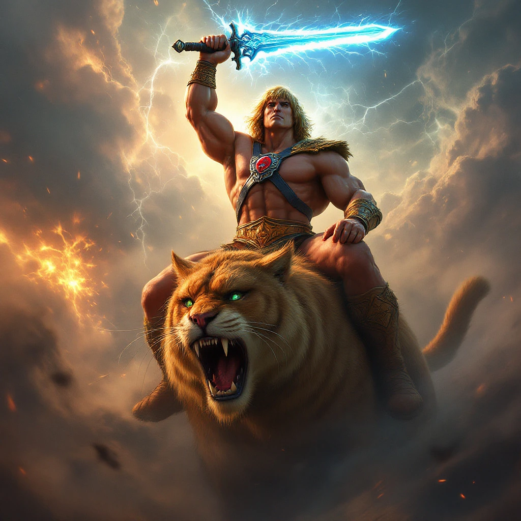 Ultra-detailed, hyper-realistic, cinematic, with sharp focus. He-Man, o lendário guerreiro, está montado sobre o poderoso Battle Cat, seu fiel companheiro, em meio a uma tempestade épica. Ele ergue sua espada encantada acima da cabeça, proclamando com imponência: "Eu tenho o poder! ". Raios místicos e energia divina crepitam ao redor da lâmina, iluminando a cena com um brilho dourado intenso. Detalhes do He-Man: Rosto perfeitamente esculpido, idêntico ao personagem clássico: mandíbula forte, queixo quadrado, olhos azuis penetrantes cheios de determinação, sobrancelhas grossas e um olhar feroz. Cabelos loiros longos e esvoaçantes, com textura realista, detalhados fio a fio. Peitoral musculoso e definido, com cada fibra muscular visível, destacando sua força sobre-humana. Armadura clássica do He-Man, com o icônico peitoral prateado e a cruz vermelha no centro, além da tanga de pele realista, detalhada com textura natural. Braçadeiras metálicas detalhadas, reluzindo à luz dos raios mágicos. Botas robustas, com pelagem marrom e detalhes envelhecidos. Espada do Poder brilhando intensamente, com runas gravadas e um brilho místico que reflete na tempestade. Detalhes do Battle Cat: Grande e imponente, com músculos bem definidos e pelagem detalhada, capturando sua força selvagem. Pele verde com padrões tigrados, cada fio de pelo visível para um efeito hiper-realista. Armadura vermelha vibrante e metálica, refletindo a luz dos raios da espada. Olhos ferozes e brilhantes, cheios de coragem e lealdade. Cenário Épico: Tempestade intensa com neve e faíscas místicas, criando um clima dramático e heroico. Montanhas colossais cobertas de gelo ao fundo, com sombras dinâmicas projetadas pela iluminação volumétrica. Efeitos cinematográficos, com poeira de neve em movimento e um fundo épico que destaca o heroísmo de He-Man. He-Man e Battle Cat estão em uma pose icônica, prontos para a batalha, simbolizando a força máxima de um verdadeiro campeão.
