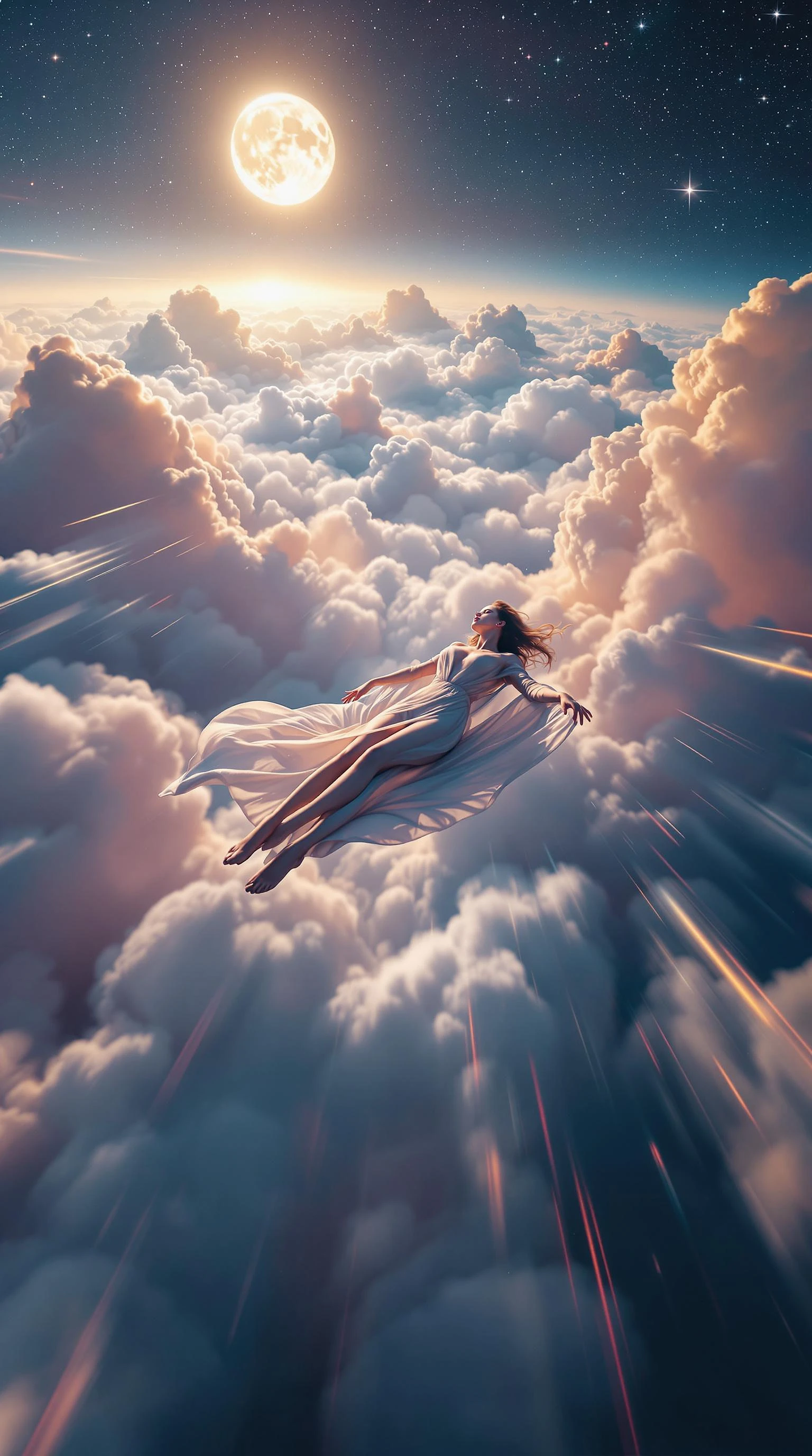 A rapid aerial tracking shot from the drone's perspective captures a surreal dream sequence of a beautiful dancer flying at high speed in a prone position. She effortlessly glides through the clouds, her body fully extended with arms outstretched to the sides, legs slightly parted, and her head forward, capturing the sensation of smooth horizontal flight. Her clothing billows in the wind as the camera closely tracks from a slightly higher angle, moving from the left rear to the right rear, maintaining a continuous view of the prone position as the character swiftly traverses the scene. The environment is dynamic and rapidly changing, with colorful clouds below and white clouds streaking by in the background, a large moon hanging high in the distance, and a sparkling night sky surrounding, with motion blur and light trails enhancing the sense of speed and fluidity. Rapid movement.