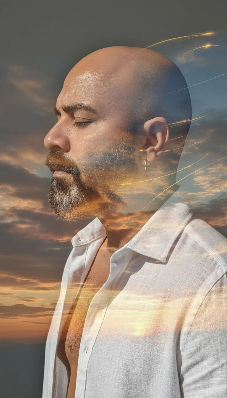 Create a dreamlike double-exposure portrait featuring the elegant side profile of a MAN with HIS eyes gently closed. HIS silhouette is clean and well-defined, with soft highlights along the curve of her forehead, nose, lips, and neck. Inside the profile, seamlessly blended, is a vivid sunset sky filled with dramatic clouds in hues of warm gold, fiery orange, coral pink, and deep twilight blue. The cloud formations drift across the contours of HIS face as though HIS thoughts are made of sky. Strands of creating a natural transition between the two exposures. The overall tone is calm, introspective, and ethereal, balancing realism in the facial profile with a painterly, atmospheric landscape. Emphasize high detail, glowing sunset light, smooth transitions, and a serene, poetic visual mood.