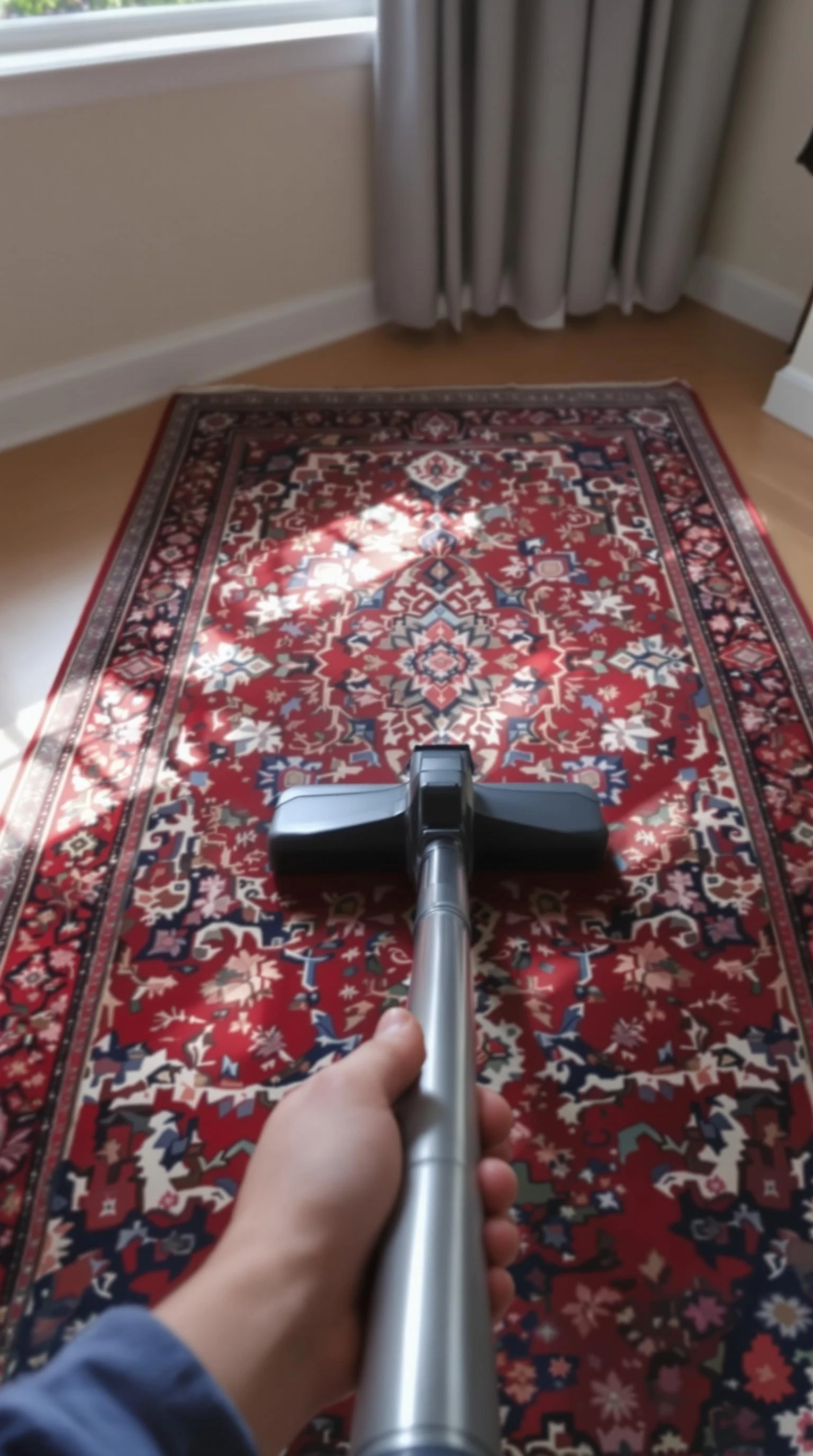 POV first-person, I am vacuuming the floor in my small, minimalist home. The camera captures my first-person perspective, showing only my hands gripping the vacuum cleaner's handle as I push it across the traditional Persian rug. The intricate patterns of the rug are visible beneath the vacuum, with the fibers slightly moving as I clean. The lighting in the room is natural, coming from a nearby window, casting soft shadows on the floor. The background is slightly blurred, keeping the focus on my hands and the vacuum cleaner in action. The scene feels realistic and natural, emphasizing the everyday task of cleaning.