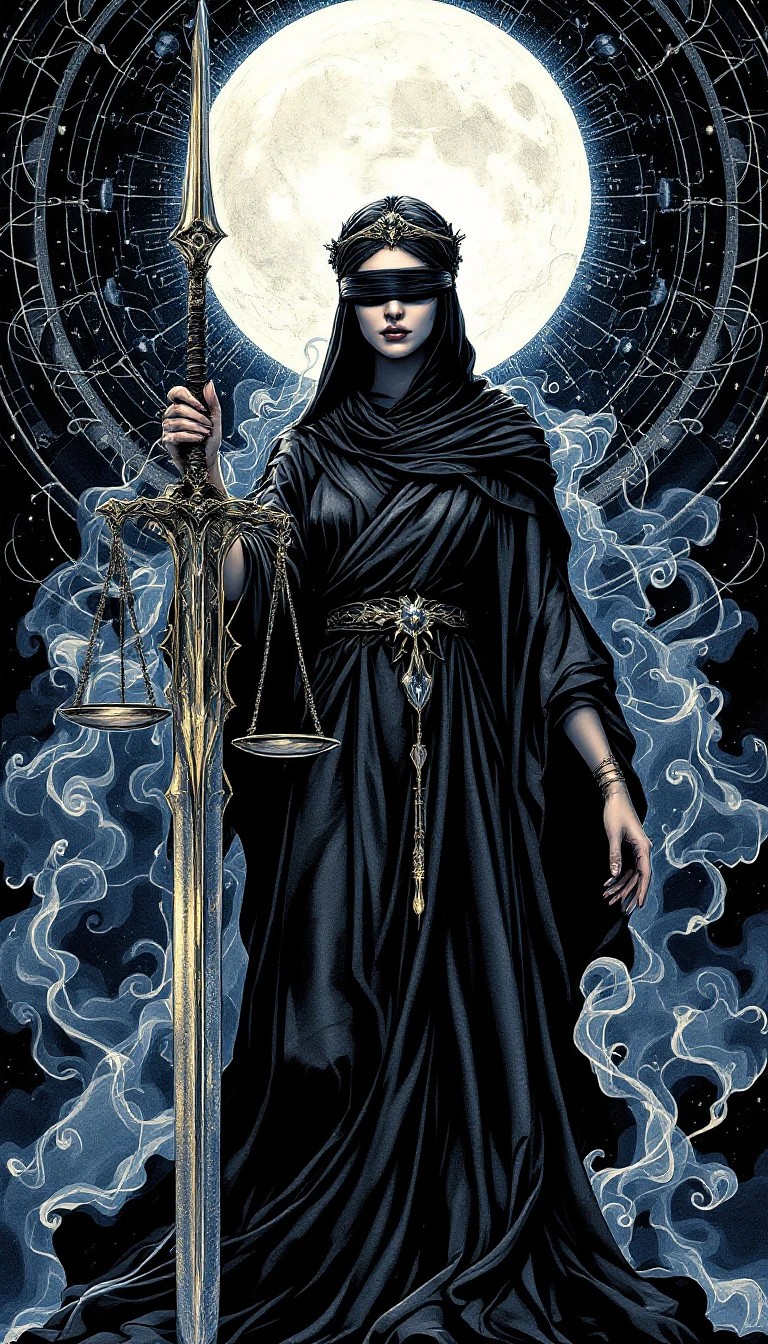 "Obsidian Sovereign in Luminous Hues": A majestic rendering of the goddess of justice, surrounded by an air of enigma with a band that conceals her eyes. She is adorned in a flowing black robe, that appears to be made of the softest, silken fabric. Her right hand holds a delicate scale, with its fine lines and perfect balance mirroring the principles of fairness and justice. Her left hand grasps a large, gleaming sword, with its surface reflecting the clear, white light of a full moon, embodying the power with which she rights wrongs. The background is a rich indigo color with complex patterns that seem to swirl like plumes of smoke. The goddess’s face, is illuminated by a soft and ethereal glow, it is a detailed example of pen and ink art, with beautiful shades and metallic tones blending to create an impression of power and serenity. The image is composed using the golden ratio, guiding the viewer’s eye to her enigmatic presence.