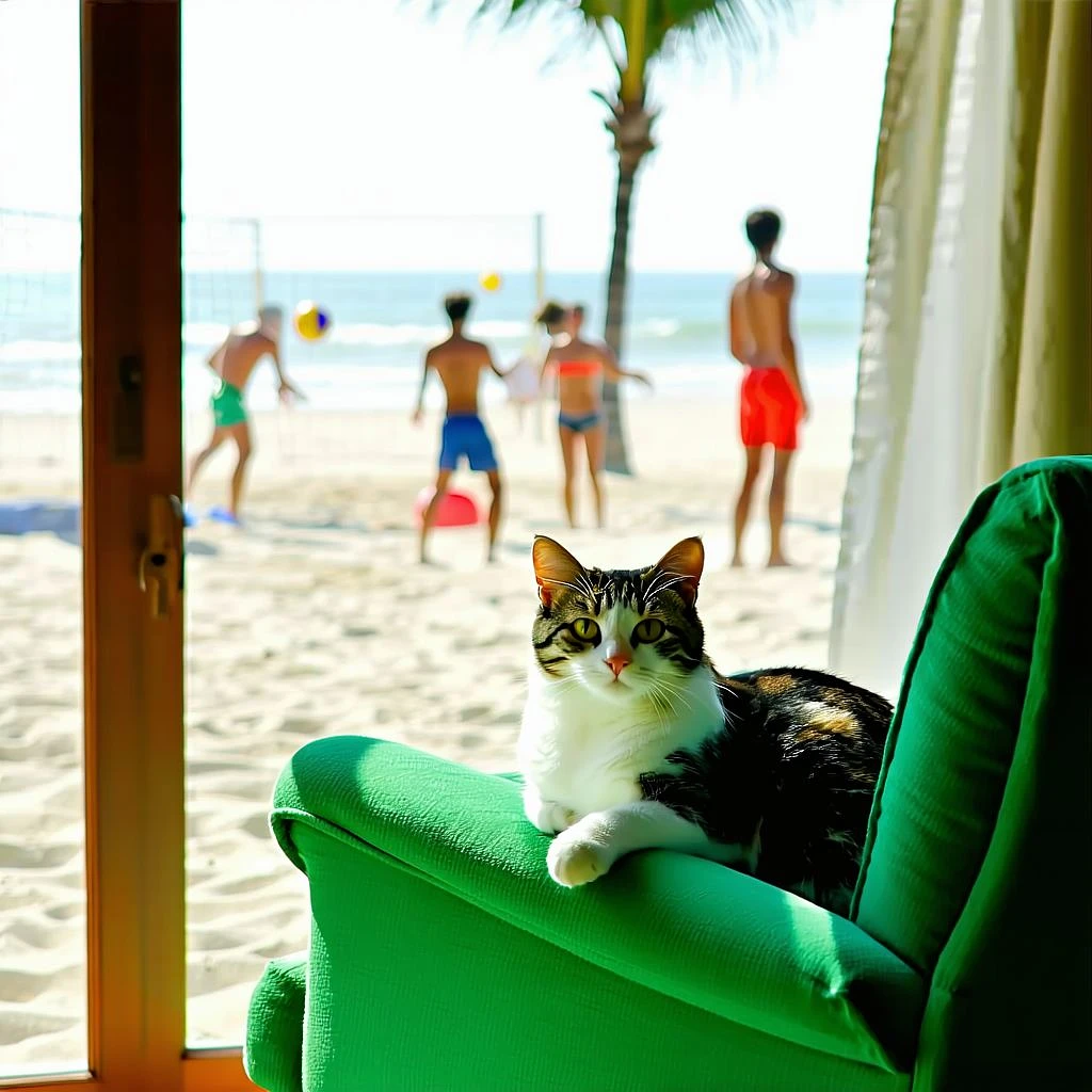 photorealistic black and white cat sitting comfortably on a vibrant green armchair, directly facing the camera with a curious gaze. The background features a large window showcasing a scenic beach view. Through the window, you can see people energetically playing volleyball on the sand, with tall palm trees swaying gently in the breeze. The lighting is bright and natural, with the sun casting soft, warm rays into the room, creating a serene and inviting atmosphere. The image should have a high-quality, detailed finish with a touch of realism, capturing the textures of the cat's fur, the fabric of the armchair, and the lively scene outside.