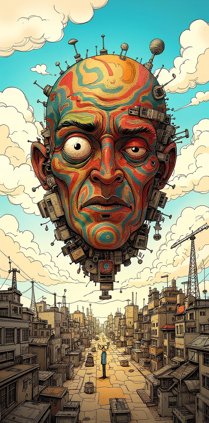 cartoon with a colorful face surrounded by a city, in the style of tim doyle, industrial forms, packed with hidden details, romantic detailed, solarizing master, agustín fernández, poster art --chaos 50 --ar 1:2 --personalize yruxpc2 --stylize 750 --v 6. 1