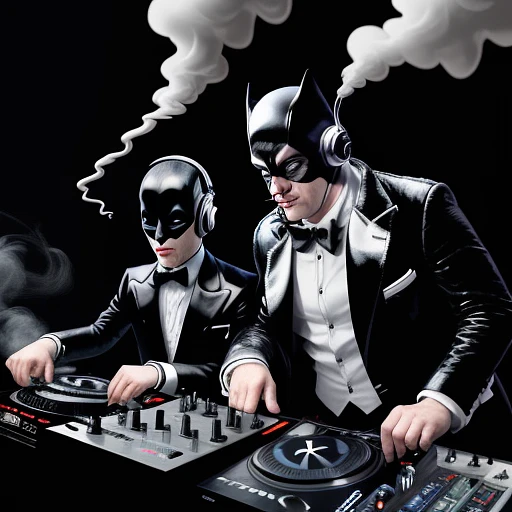 dj penguin dressed in black and white smoke with his dj headphones and his dj equipment with batman by his side at a party at the wayne mansion in gotham city