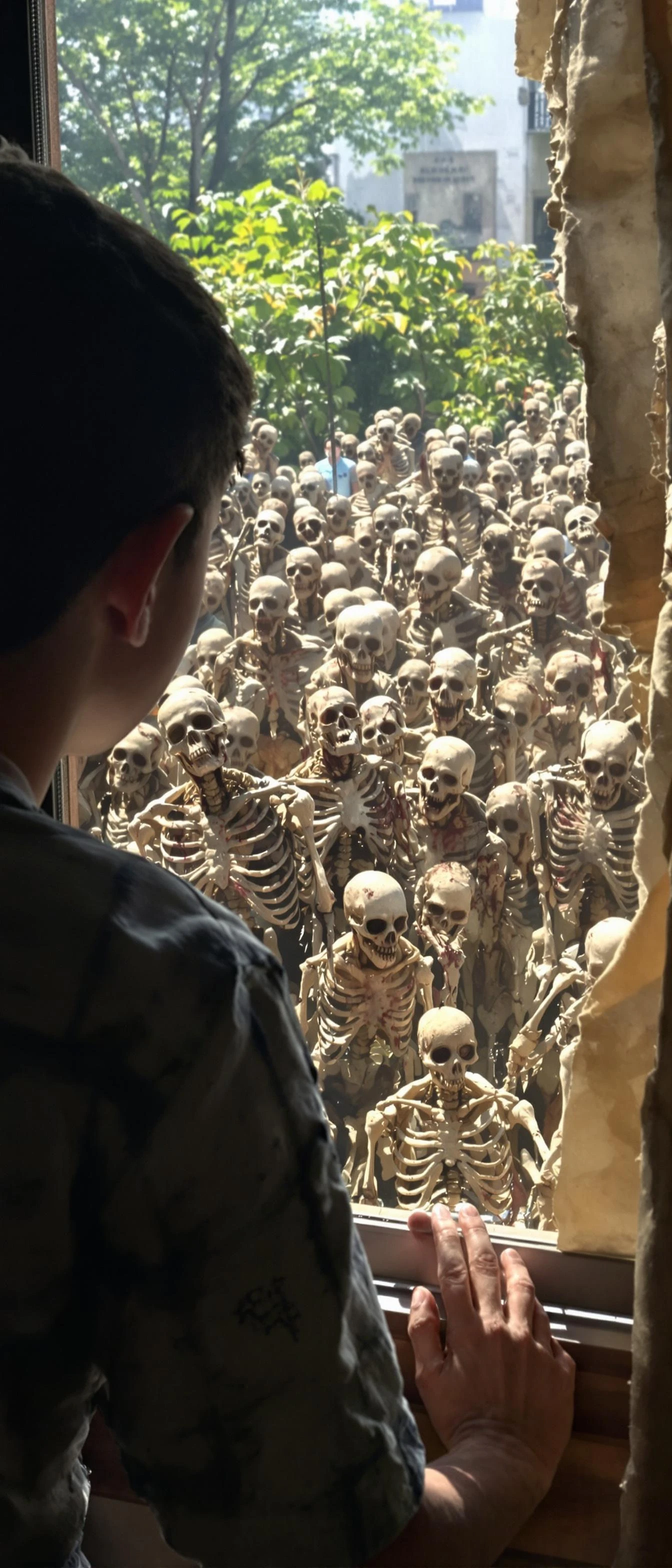 A boy looking from a window at daylight and sees many walking dead people . Their body are fleshy or half fleshy . Some bodies have skin intact . Some bodeis are semi skeleton and semi fleshy . Their body are exposed . Hyperrealistic. Hyper details . Hyper face and body details . 8k . High quality .