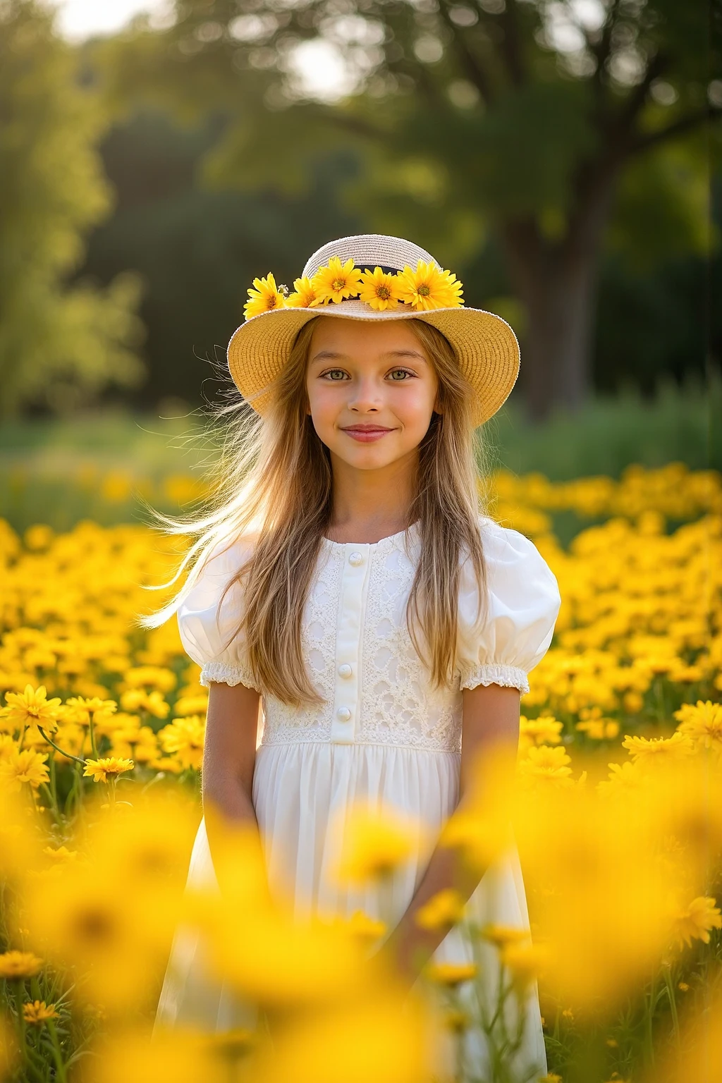 In this masterpiece of photographic artistry captured by the precision of a Nikon D500 camera, we find ourselves immersed in an idyllic scene under the vibrant glow of a late afternoon sun. A young, lively girl AIDA_FXLR_apv2020 stands amidst a breathtaking landscape of yellow flowers that blanket the earth, evoking images of springtime delight and joy. The girl AIDA_FXLR_apv2020, 6 years old with accurate anatomy and realistic hair, dons a white dress adorned with delicate lace detailing and voluminous puffed sleeves - the epitome of cheerful, youthful fashion during warm seasons. Her long blonde locks fall loosely around her shoulders as she exudes playfulness through her open mouth and bright eyes that sparkle with life under the soft sunlight's gentle touch. A whimsical addition to her ensemble is a straw hat crowned with yellow flowers that perfectly matches the surrounding flora, adding an air of enchantment to the image. The lush greenery in the backdrop and dense foliage suggest a serene outdoor space bathed in natural daylight, creating depth and texture within the photograph's frame. As night falls and darkness sets upon the scene, one might envision ethereal candles or moonlit branches illuminating her face with their mystical glow, transforming this vibrant daytime image into a nocturne of enchantment and wonder. This exquisite photograph exemplifies outstanding quality and sharp focus while celebrating the beauty of youth and nature in its most captivating form.