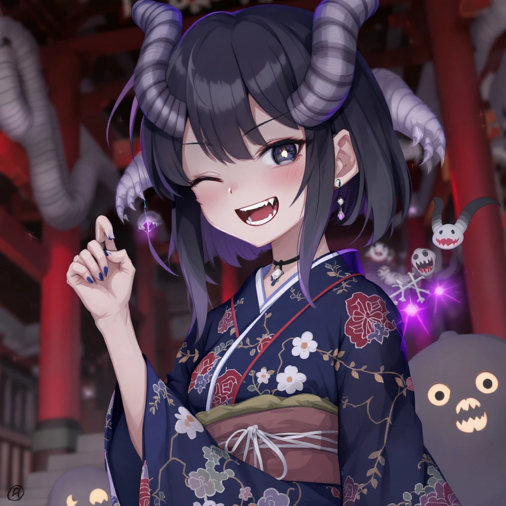monster girl, solo, oni girl, horns, kimono, japanese temple, spirits, yokai, vampire teeth --ar 4:5 --s 250