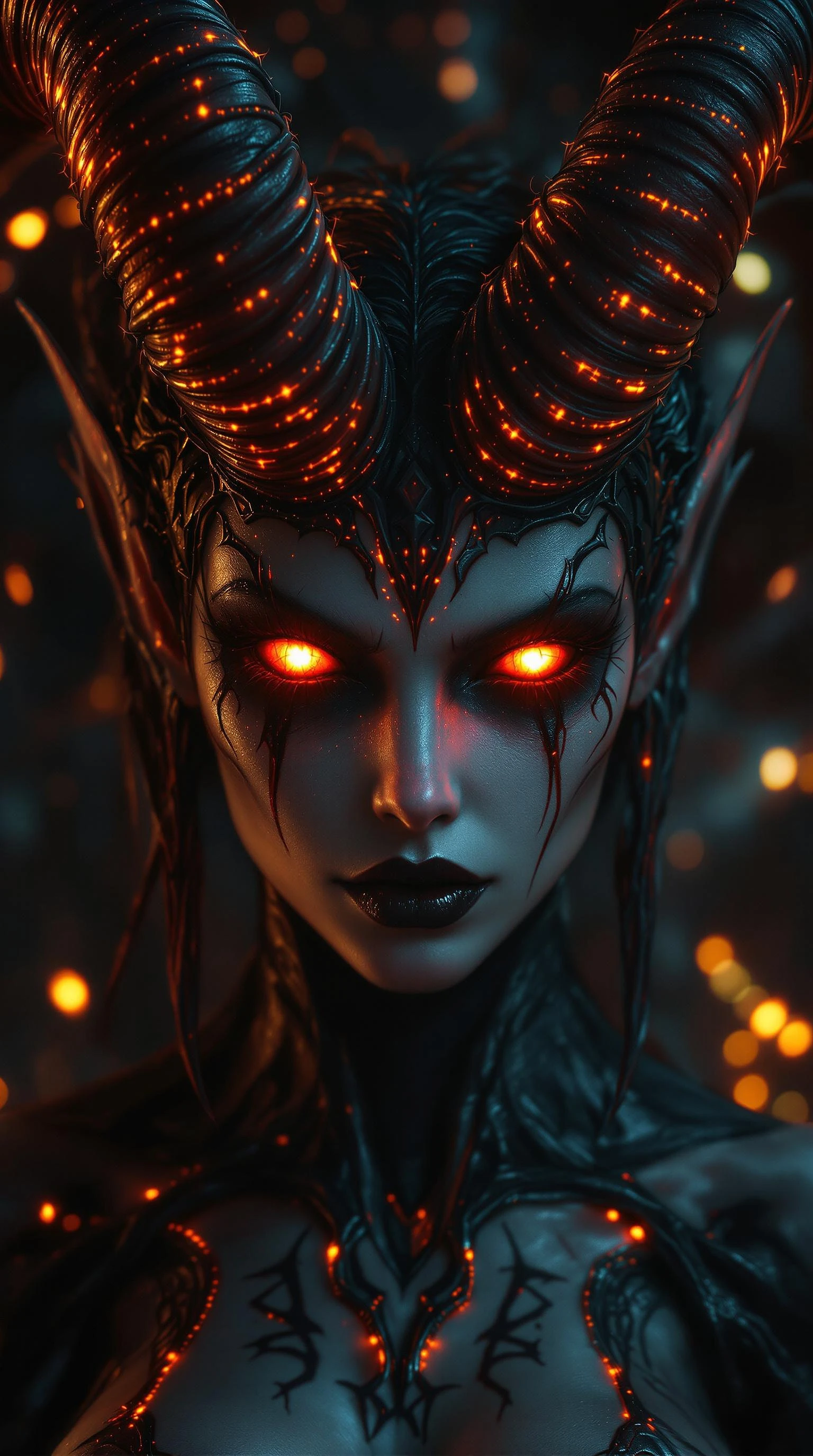 A professional photo of a demon girl with horns and glowing eyes, (masterpiece) , (realistic) , (full body) dark fantasy, very realistic, eerie atmosphere, intricate details, glowing markings on the skin, demonic features, 4k resolution, ultra detailed, photorealistic, front view, highly detailed, volumetric, dramatic lighting, perfect graphics, ultra detailed, photorealistic, full screen view, full body view, front view