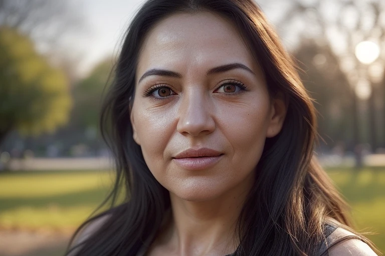 "Generate a hyperrealistic detailed portrait in a warm urban park setting during a sunset. Emphasize the contrasts of lights and shadows to highlight facial details. Ensure to capture the reflections in the eyes for a lively look. Add subtle wrinkles and skin textures for enhanced realism. Pay special attention to the texture and shine of the lips for a natural appearance. Incorporate natural elements like trees and flowers in the background to complement the portrait's story, Resolution: 3000x4000 pixels, Camera type: High-resolution digital SLRLighting: Natural light source with soft diffused light to minimize harsh shadows, Depth of field: Sharp focus on the face, with a gentle background blur. "