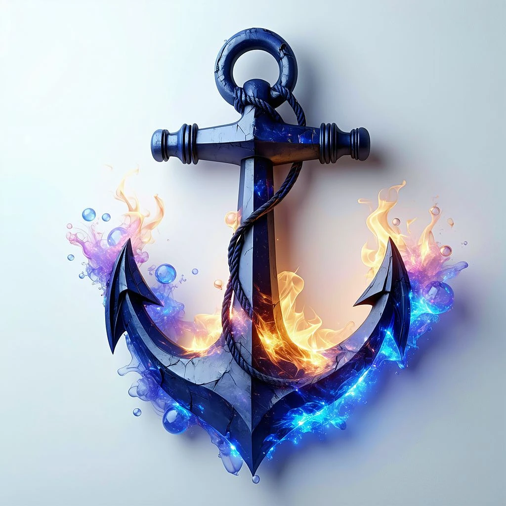 A finely detailed, steampunk-inspired anchor vector mounted on a white wall. The anchor features glowing dark blue plasma and gears. The numeral " {] [} " is clearly rendered in high-quality graphics. Ultra-realistic 8K lighting, cinematic compositing, volumetric lighting, ray-traced effects, HDR rendering, realistic textures, atmospheric depth, dynamic contrast, high-resolution shadows and highlights, smooth color gradations, and stunning clarity. The anchor contains boiling water with glowing neon bubbles in shades of deep yellow, pink, and purple, resembling a sophisticated chemistry experiment. Unusually multicolored vapor emanates, transforming into flame-like liquid forms, blending with shades of blue, gold, and purple, producing a mesmerizing cinematic effect. The anchor appears to blend seamlessly into the texture of the wall.