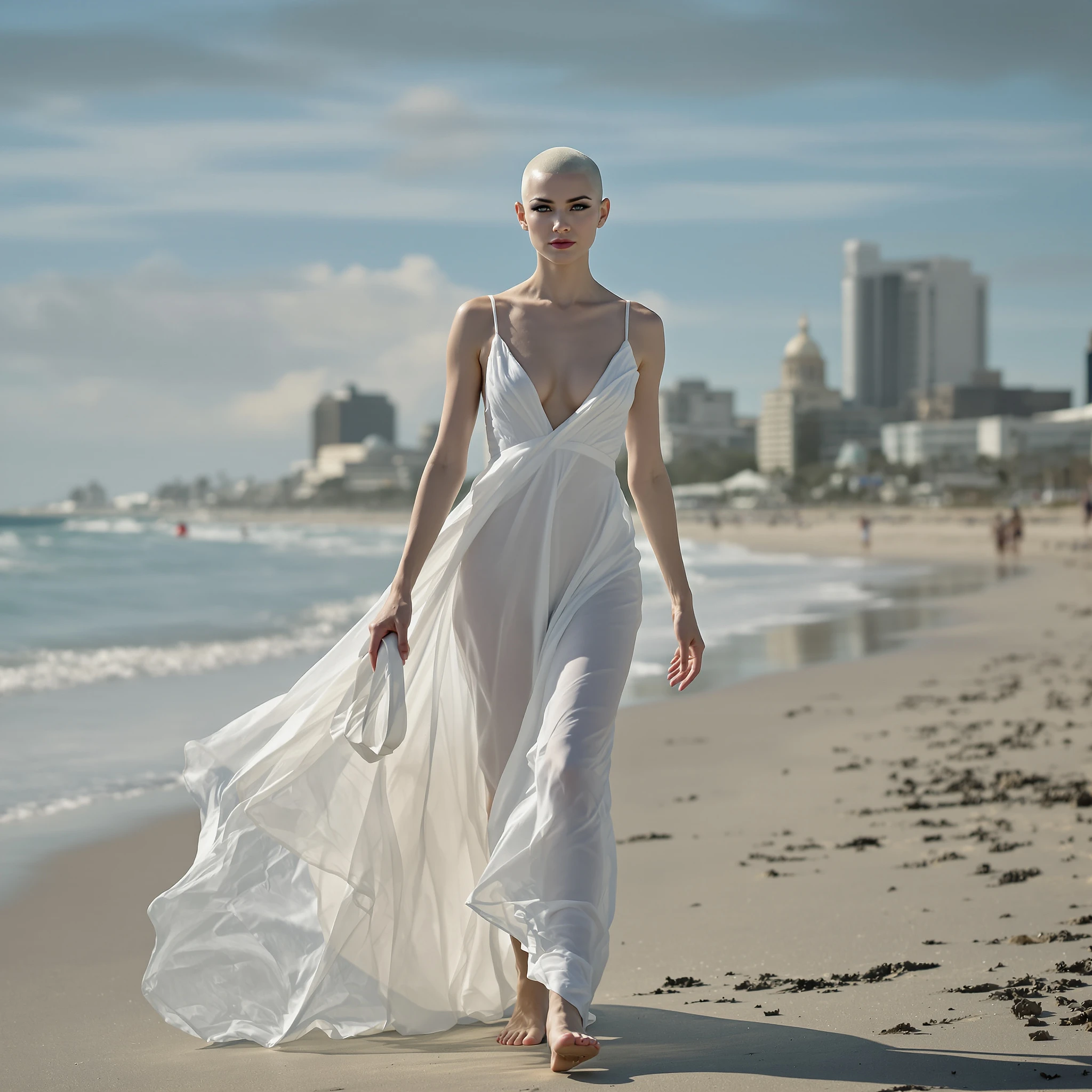 4K ultra-detailed cinematic portrait of Lilas, a tall, slender mature woman with a perfectly shaved buzz cut and luminous white hair. Her eyes have a gradient color of blue. She gracefully dons a flowing, very translucent white gown at the city beach, walking barefoot on the sand with her shoes in hand. The chiaroscuro lighting emphasizes her slender form, casting deep shadows across the beach. The scene bursts with vibrant, liquid sun tones and cinematic bokeh, enhanced by precise, sharp focus and masterful volumetric lighting. Every detail from her flawless anatomy to the dynamic elegance of her presence unfolds in a candid, creative style that feels like a living masterpiece. score_13, score_28_up, score_37_up. photography. portraiture. catch light in eyes. one flash. rembrandt lighting. Soft box. dark shadows. High contrast. 80mm lens. F2. 8.