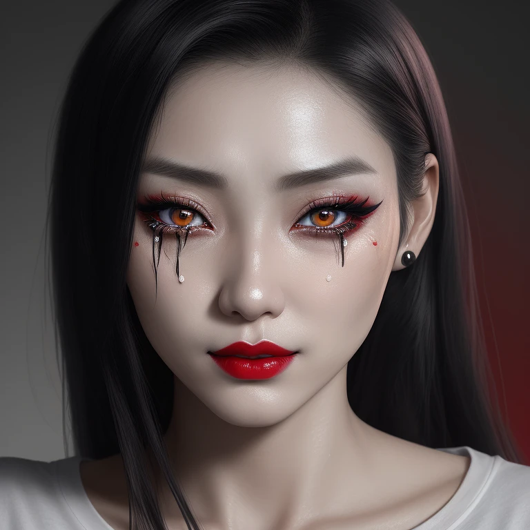 hyper realistic headshot photo of a 25 year old corean woman, white t-shirt, extreme slim, extreme skinny, red lipstick and black eyeshadow, she has a depressed look, some tears on her face and her makeup is smudged, expensive jewelry, looking into the camera, smiling slightly, ultrarealistic, soft lighting, 8k