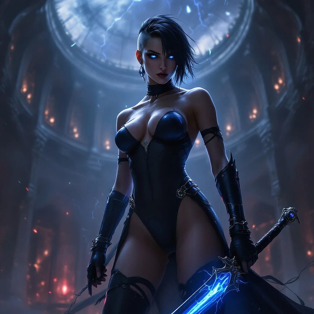 photo in the style of warhammer 40k of a female comissar, standing infront a gothic circh, holding a sabre with blue lightning, cybereyes, black ultra tight onepiece bathsuit, black sidecut hair, very giant tits
