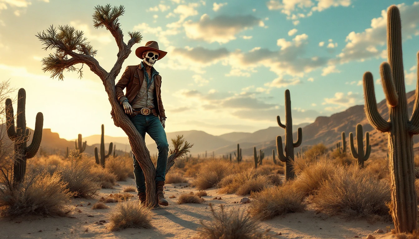 Un hombre con cara de calavera caminando apoyado en un árbol seco en mitad de un desierto. Quiero que lleve una guitarra en una funda y que se vean cactus. Quiero que la escena sea al atardecer y que sea jovial. Estaría bien, ya que están en el desierto y al atardecer, que aparecieran cactus. Quiero que el estilo sea tipo western. Su camisa debe ser azul marino y su chaqueta debe ser marrón oscuro, además debe llevar un pañuelo granate en el cuello y un sombrero de cowboy. La guitarra debe estar en una funda y la debe llevar en la mano derecha.